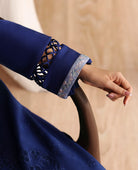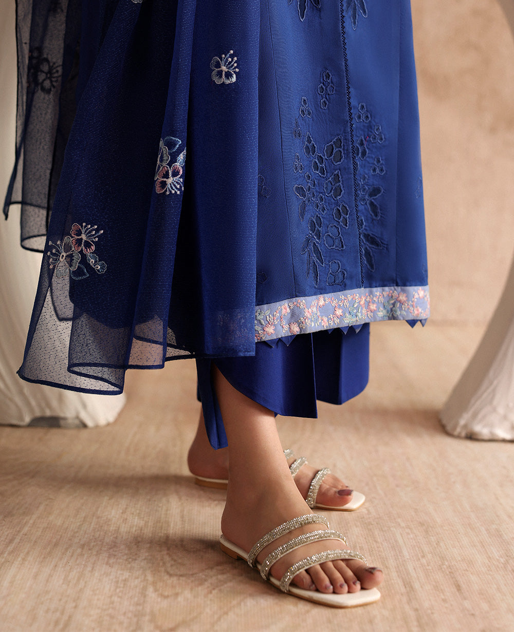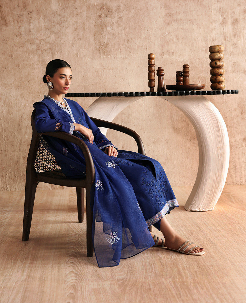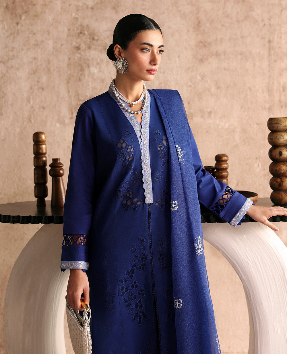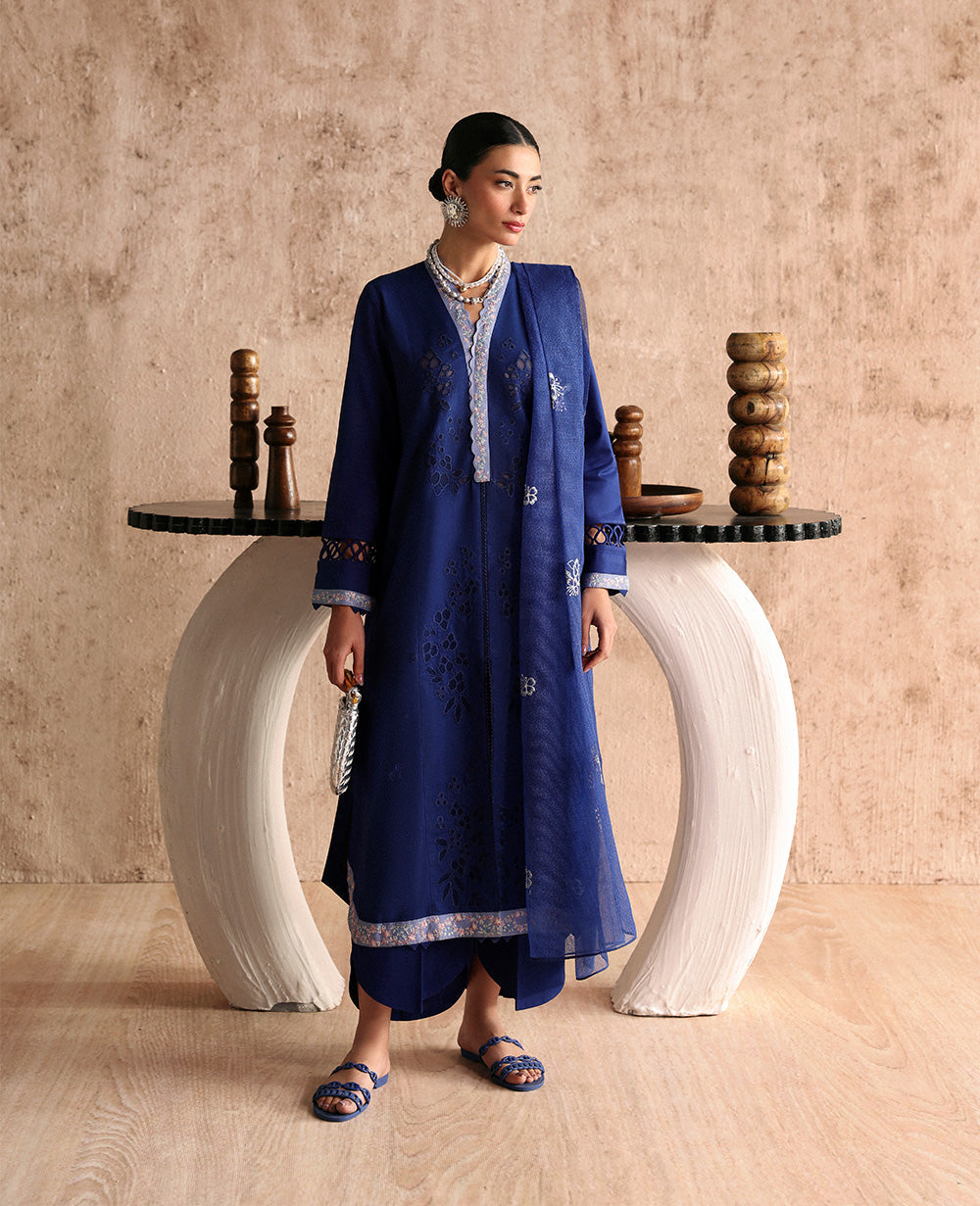 'Kaida, is a sophisticated blend of contemporary design and traditional craftsmanship. The laser-cut lawn shirt, with its intricate detailing and self-on-self embroidery, is a modern masterpiece. The side curve trousers add a sleek, tailored touch, while the ethereal dupatta with its running spray pattern completes the ensemble with a touch of light and airy grace.