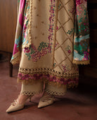 A creamy beige canvas is elegantly adorned with intricate threads in sumptuous garnet and soft pink, creating a harmonious blend of colors. The beautifully embroidered borders, featuring delicate tonal variations, add a captivating depth that enhances the overall design. Complemented by a striking printed viscose shawl in rich garnet, telling the tales singing into the colors of nature, this ensemble radiates sophistication and style. With its perfect fusion of timeless elegance and exquisite craftsmanship, it stands as a collector’s dream- regal, refined, and truly unforgettable.