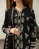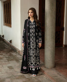 Make an unforgettable statement this winter with this captivating black-and-white ensemble. The black karandi fabric serves as the perfect canvas for meticulously crafted floral embroideries in shades of black and white, delicately accented with hints of Laguna, azure, and soft cream. Thoughtfully tailored for both elegance and comfort, the look is complemented by a sumptuous Acrylic shawl, richly adorned with blooming floral motifs and intricate patterns that add depth and texture.