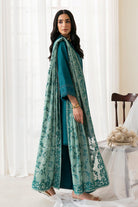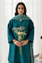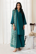 A deep teal blue set featuring a sleek loose straight kurta with delicate neckline detailing and lace work on sleeves, paired with wide-leg pants and an intricately embroidered contrast dupatta. A perfect blend of elegance and grace.