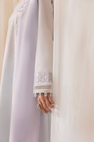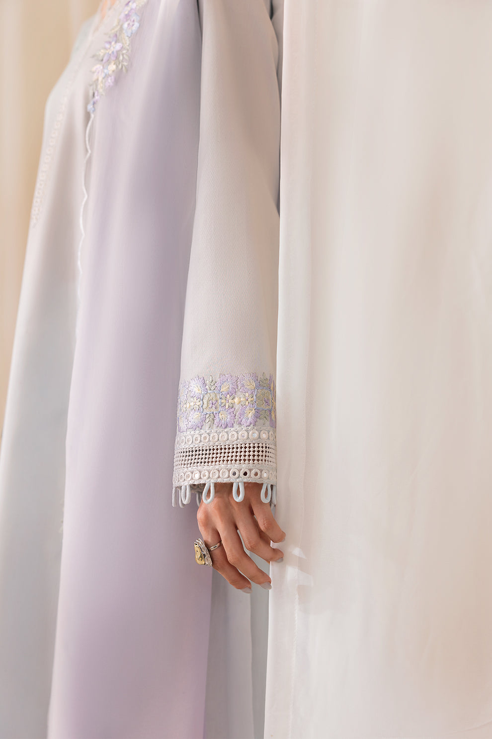 A dreamy ice blue ensemble adorned with delicate shisha embroidery, enhanced by intricate stitching details and elegant lace finishes. The look is completed with a stunning tie and dye dupatta, framed with beautifully embroidered borders perfectly balancing grace and craftsmanship