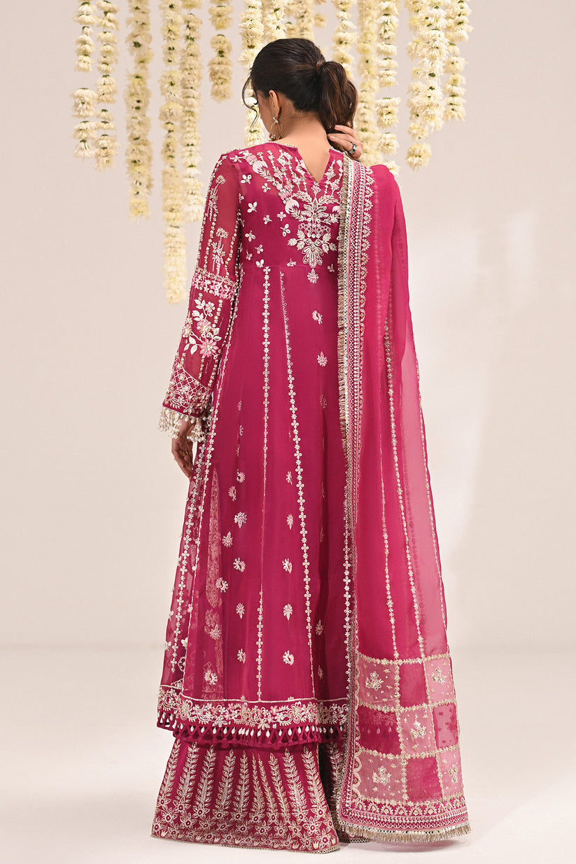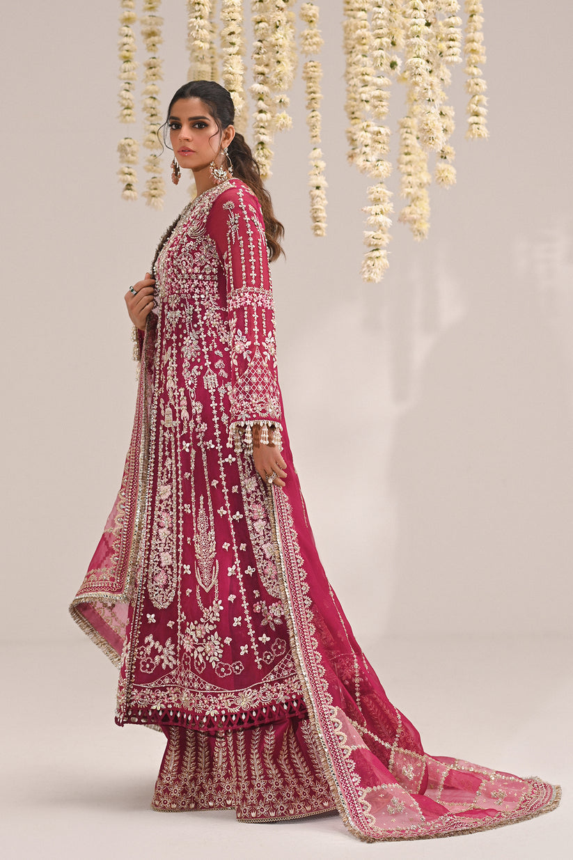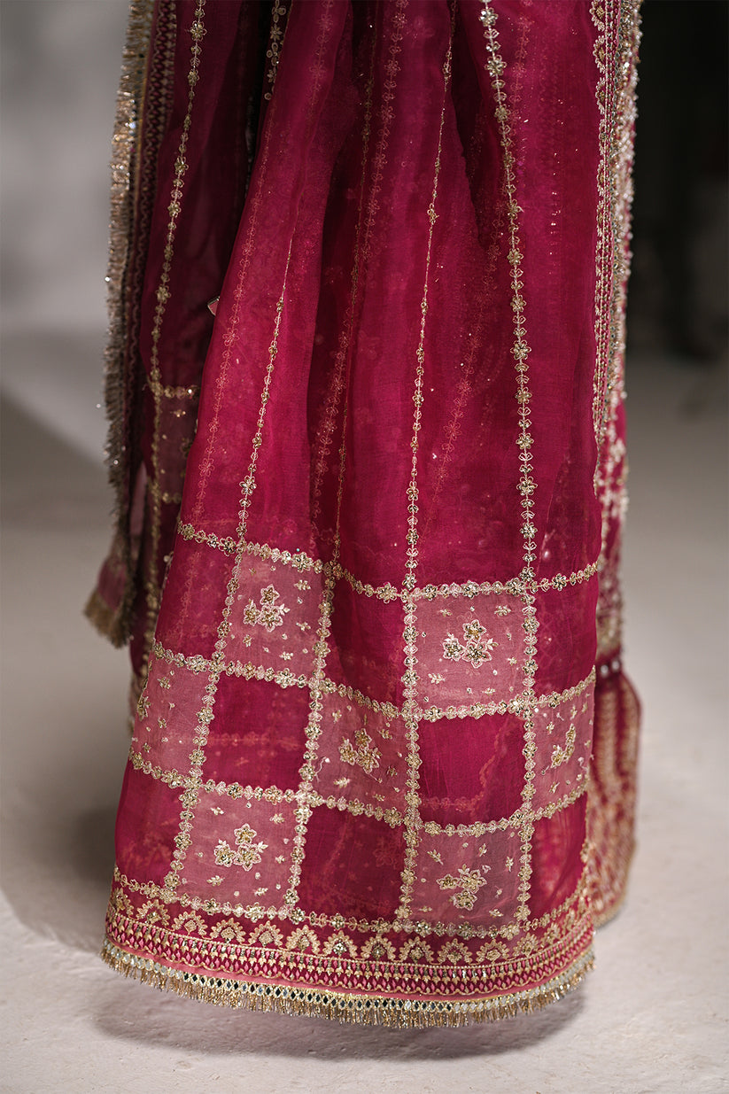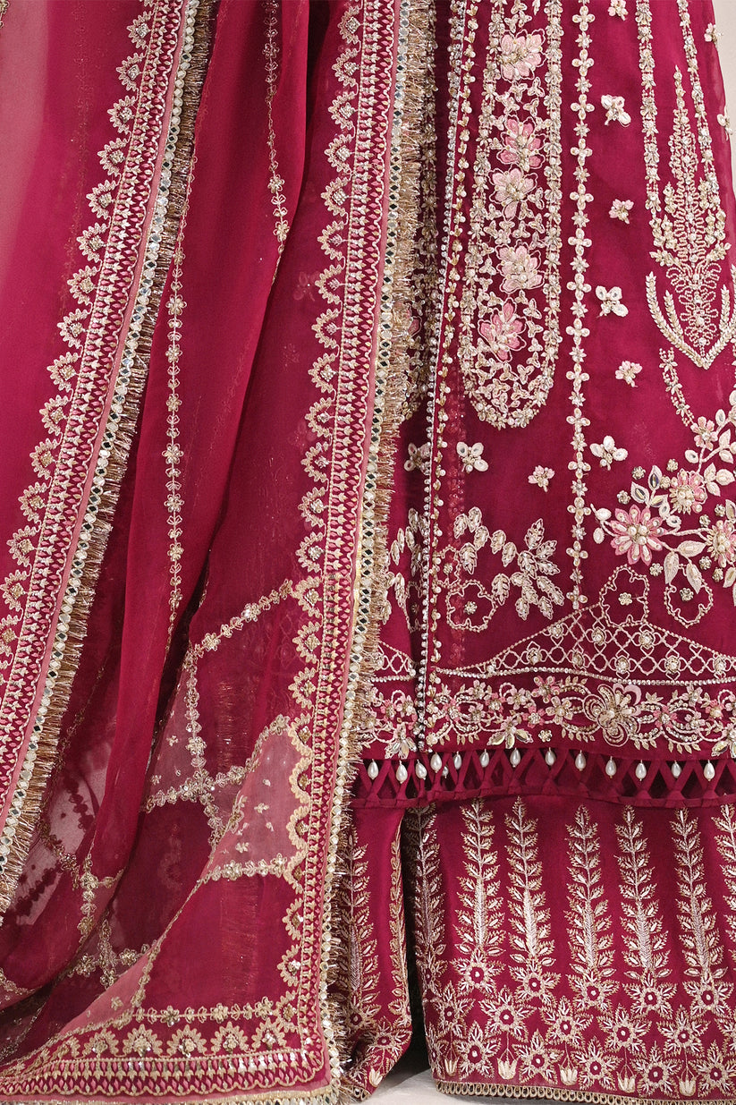 This stunning ensemble, designed in a rich deep magenta hue, is crafted on luxurious organza fabric, paired with raw silk azaar pants and an ethereal organza dupatta. The outfit features intricate embroidery complemented by exquisite hand embellishments, adding a timeless charm to its design. Perfect for festive occasions, it embodies elegance and grace in every detail.