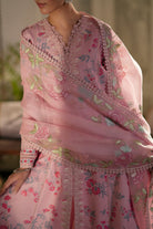 This pastel pink Kalidar features delicate floral prints in soft shades of pink, blue, and green. Its flowy silhouette exudes effortless grace, making it a timeless choice for any occasion. Paired with an intricately embroidered organza dupatta and classic azaar pants, this ensemble is the epitome of elegance.