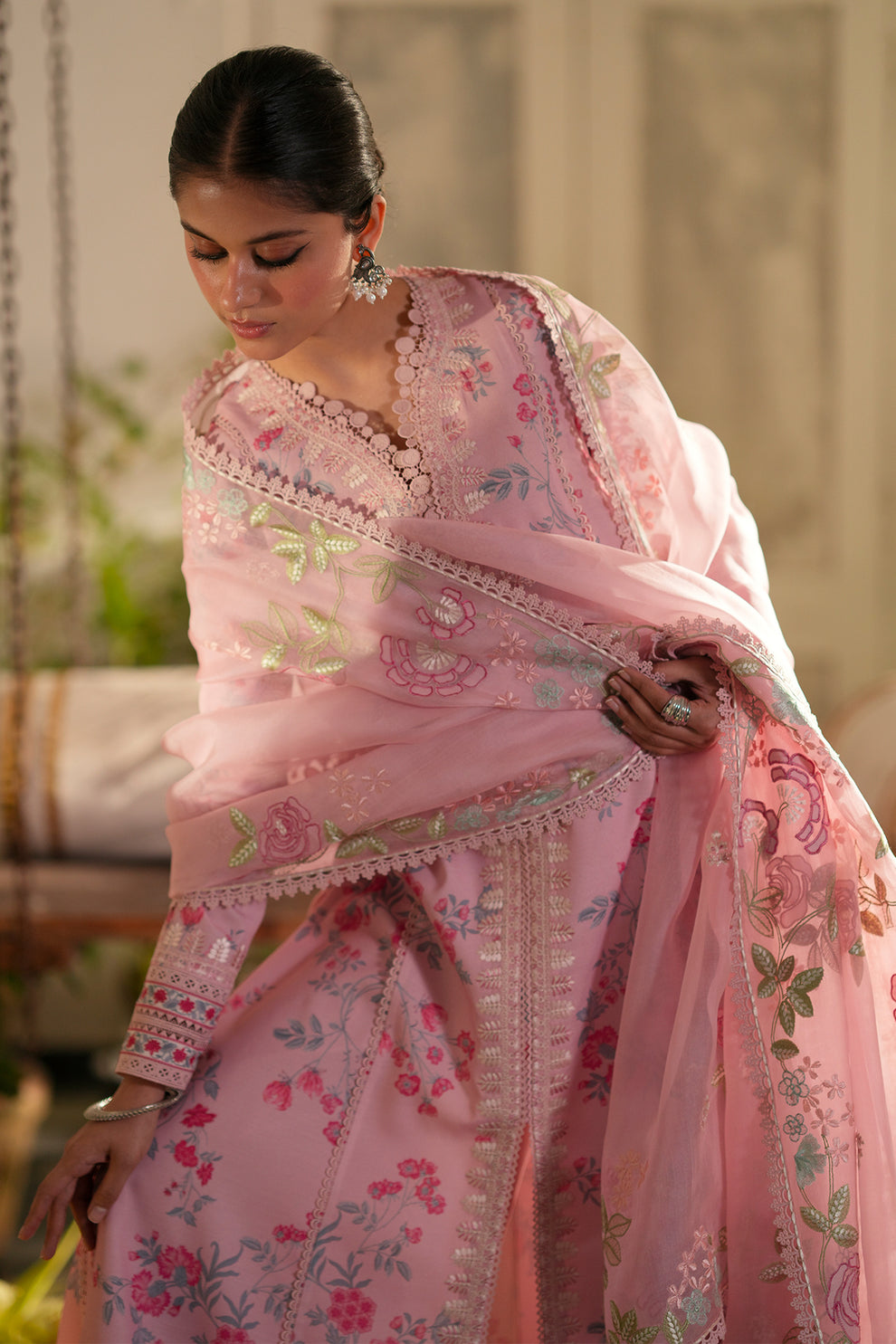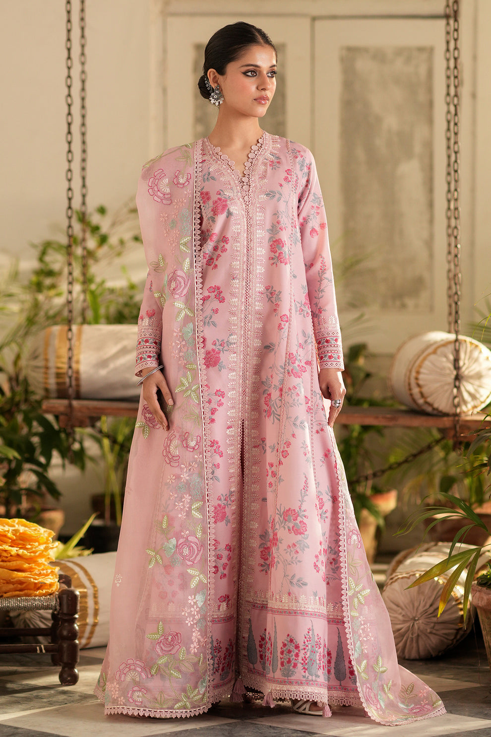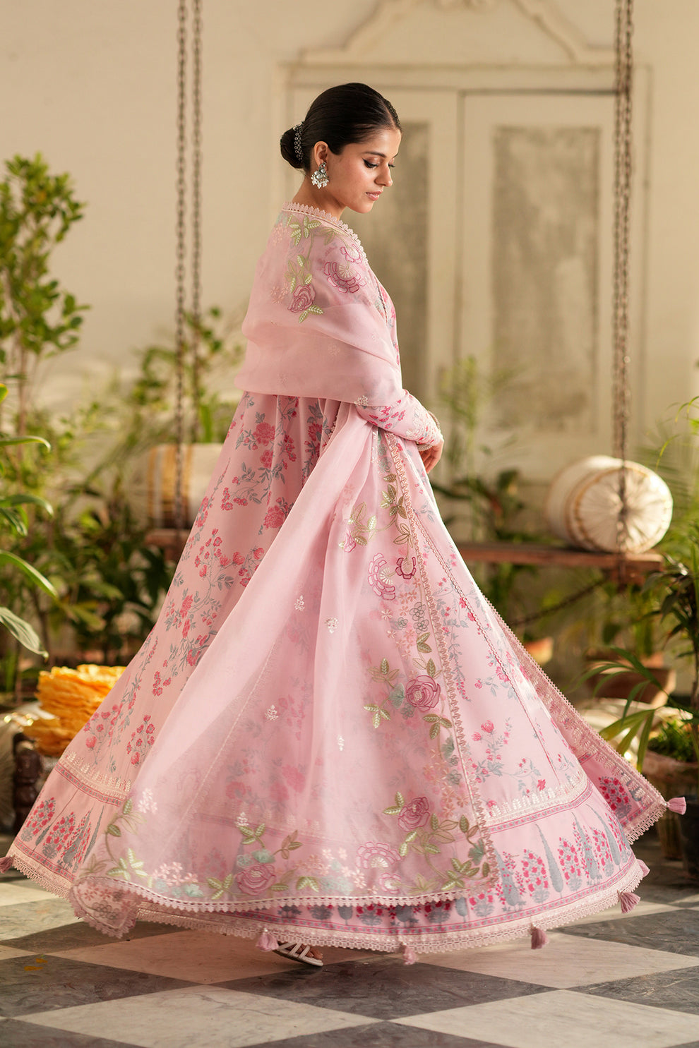 This pastel pink Kalidar features delicate floral prints in soft shades of pink, blue, and green. Its flowy silhouette exudes effortless grace, making it a timeless choice for any occasion. Paired with an intricately embroidered organza dupatta and classic azaar pants, this ensemble is the epitome of elegance.