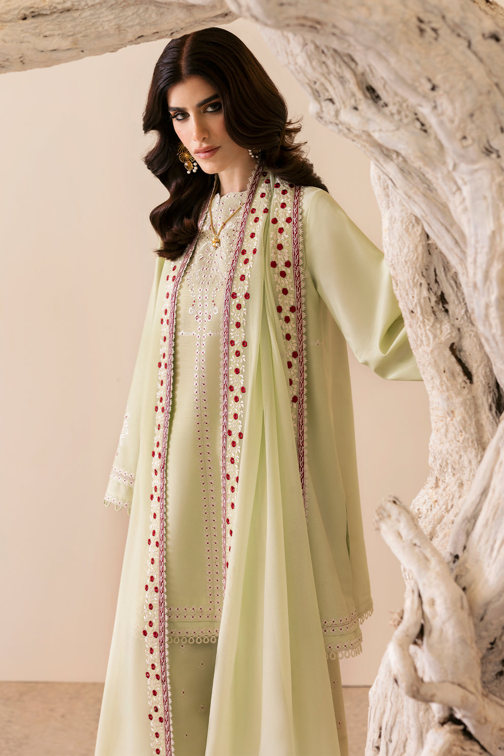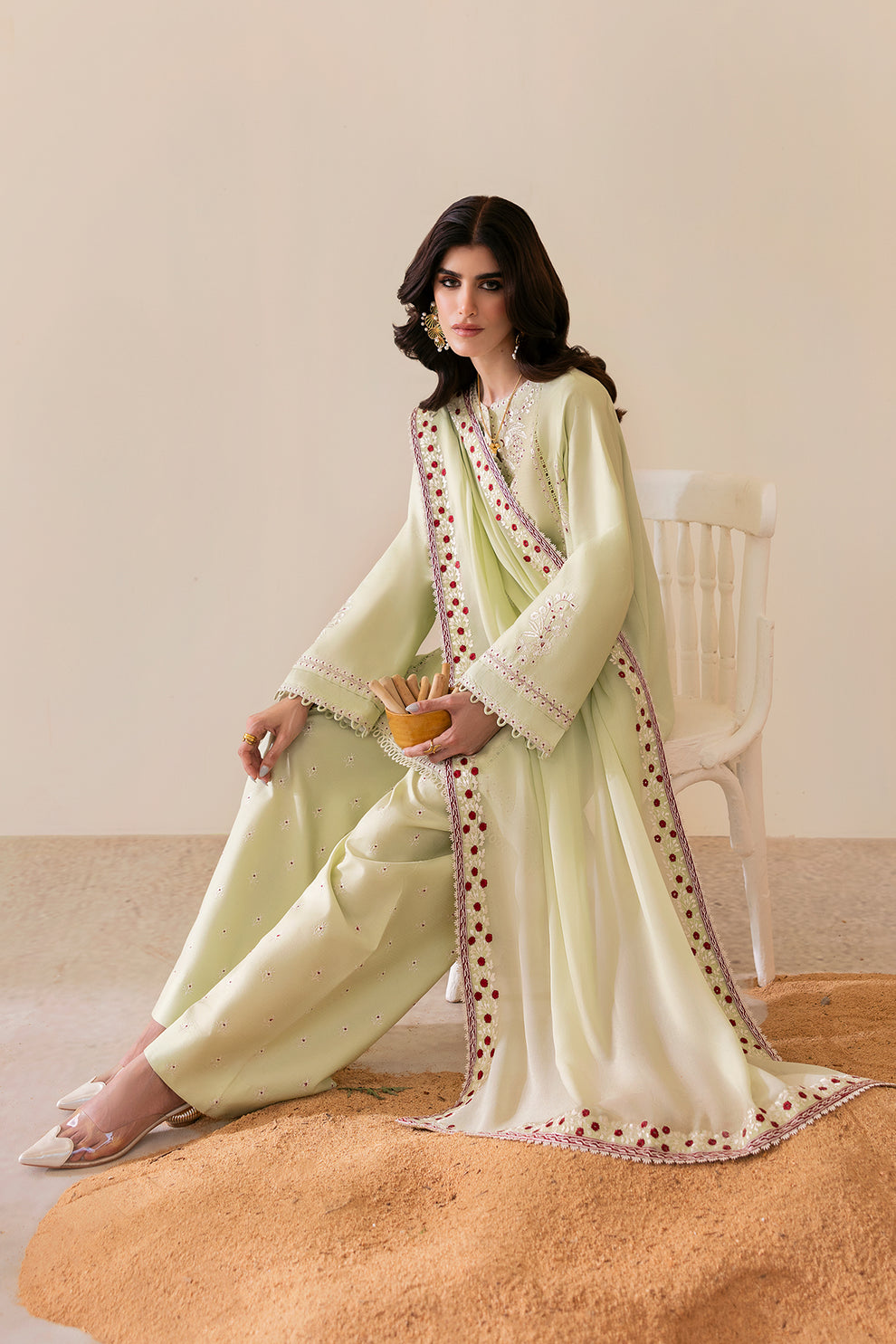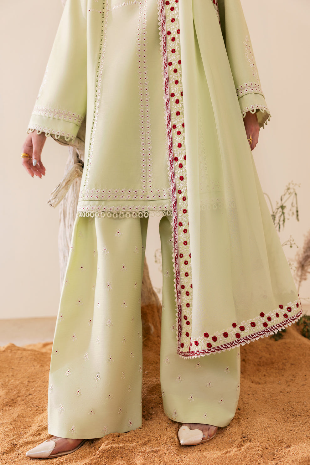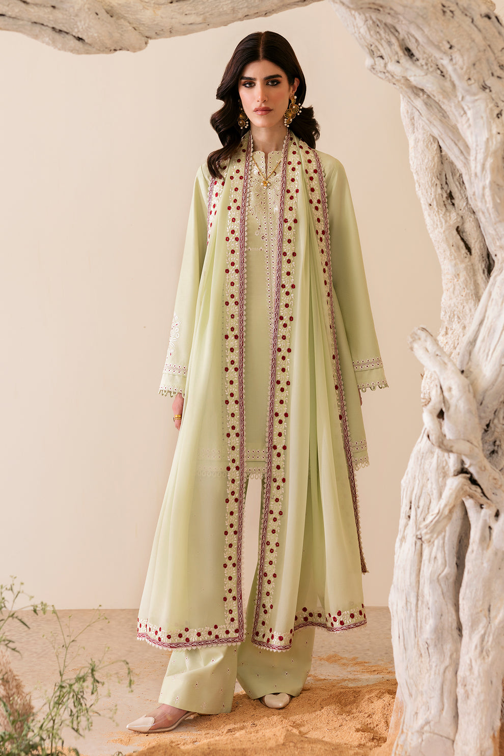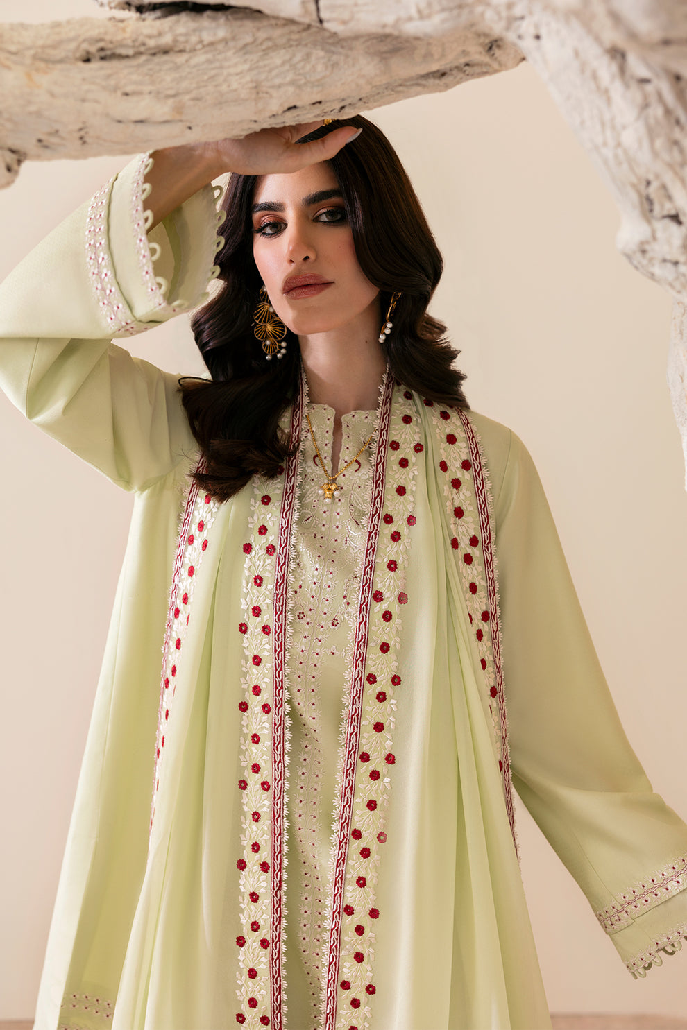 A refreshing ensemble featuring a soft pistachio green lawn kurta adorned with intricate embroidery, paired with a matching shalwar delicately sprinkled with boti work. The look is completed with a beautifully embroidered dupatta, detailed with accents of maroon and fine lace finishing, adding an elegant contrast to the soothing base.
