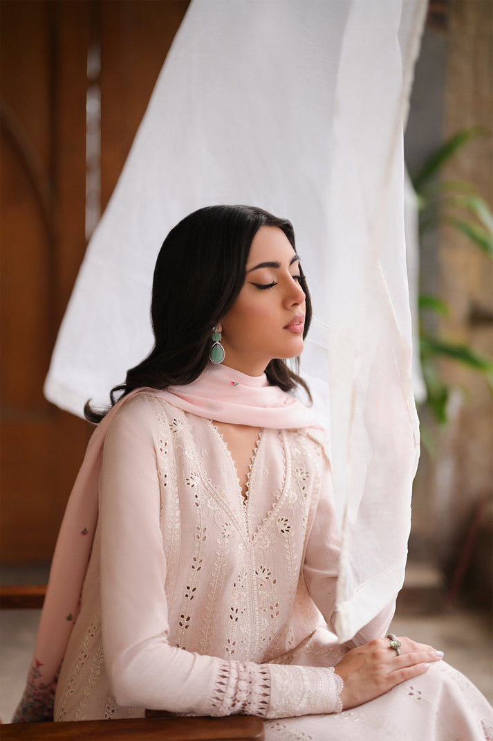 The nude pink dress features intricate off-white cutwork embroidery, adding an elegant touch to the ensemble. It is paired with straight pants for a modern and sophisticated look. The beautiful printed lawn dupatta completes the outfit, adding a vibrant and stylish element. It is a stunning choice for any special occasion in summer.
