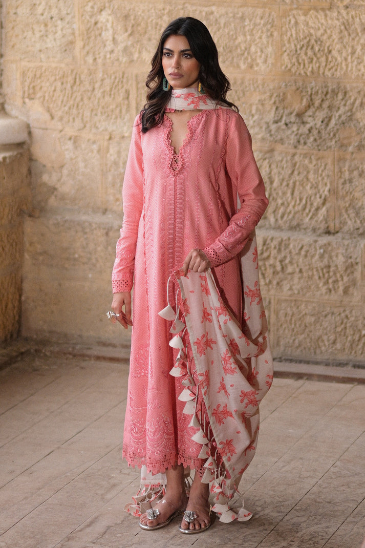 This exquisite rose pink dress with delicate self-embroidered details and a beautiful floral print lawn dupatta. The straight pants with cutwork details add a touch of elegance. It’s a simple yet stylish outfit that will make you feel confident and beautiful.