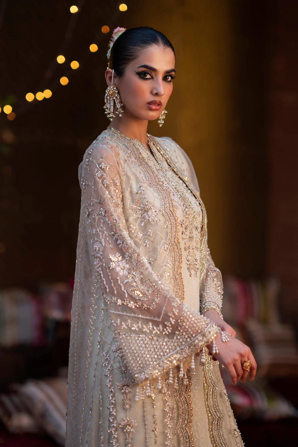 An ethereal mint green open-style gown adorned with delicate handwork, paired with a self-on-self sequined inner shirt for a subtle shimmer. Completed with an intricately embroidered dupatta, this ensemble blends elegance with timeless charm—perfect for making a graceful statement.