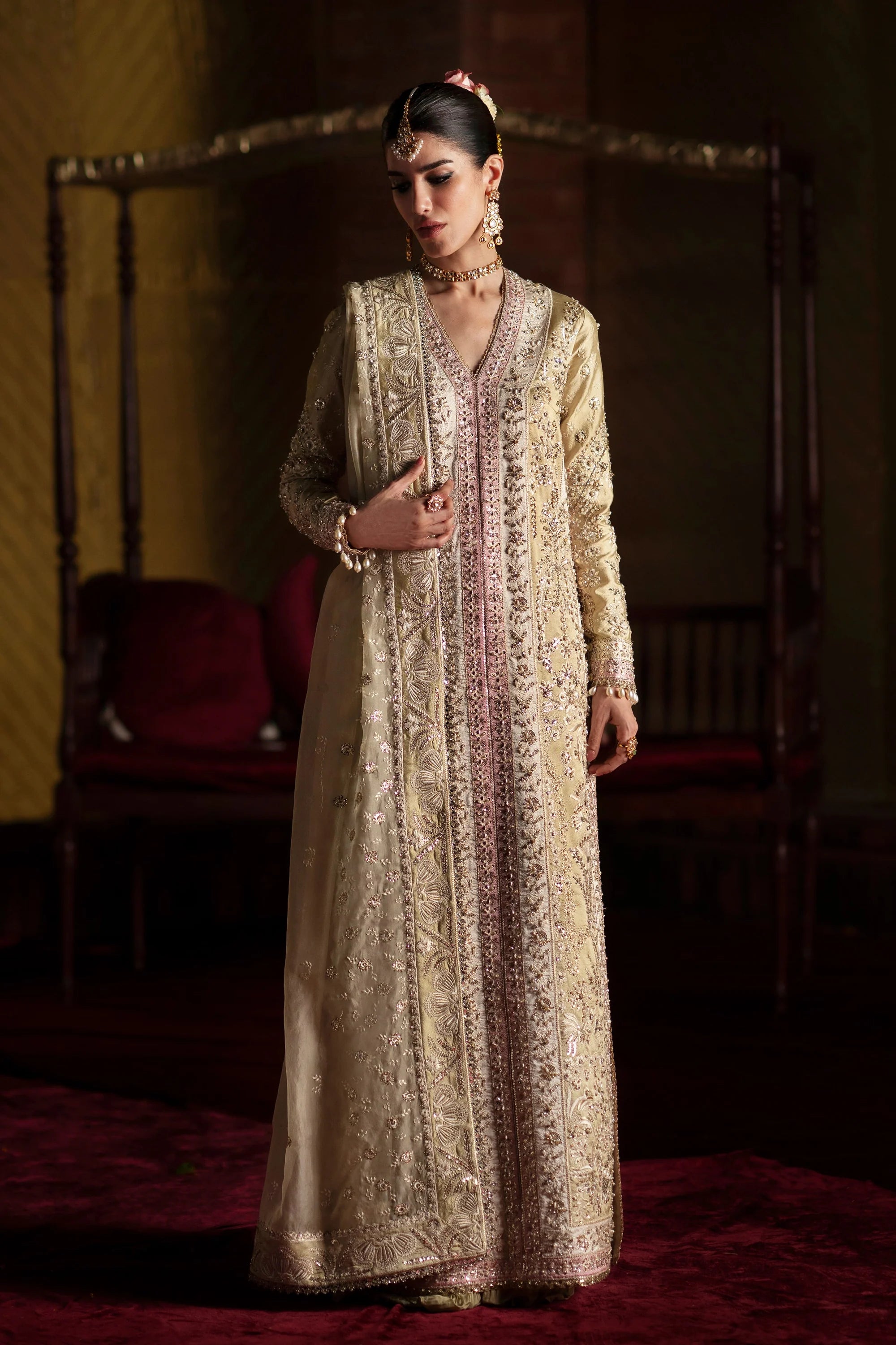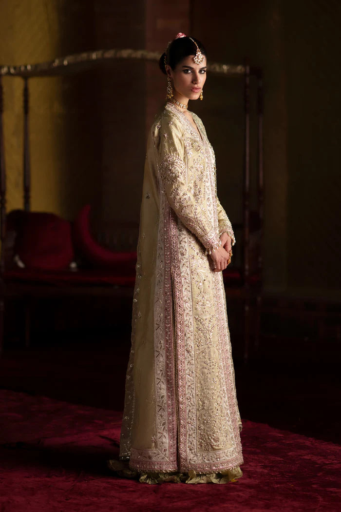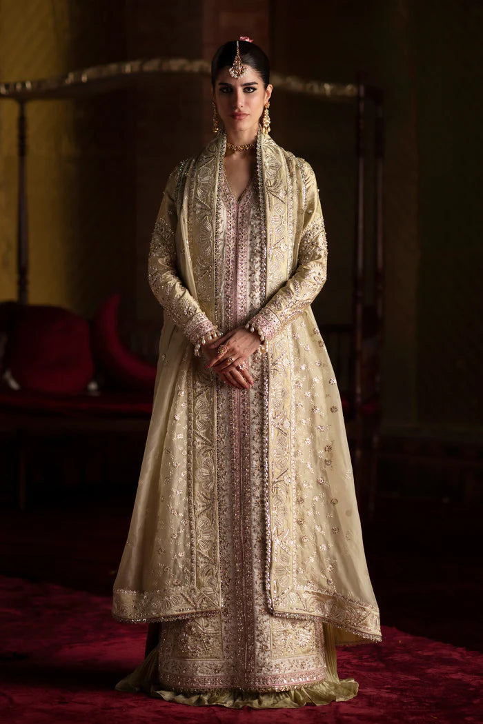 A stunning long pastel olive shirt on luxe tassel silk, adorned with delicate embroidery and intricate handwork. The design is elevated with elegant color-blocking side details, making it truly eye-catching. Paired with a beautifully embroidered dupatta and finely crafted hand-worked sharara pants, this ensemble blends grace with timeless artistry.
