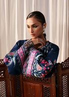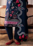Navy Blue khaddar shirt features Turkish embroidery motifs set in a striking palette of pinks and lavenders. Paired with a matching trouser and shawl framed with a beautifully scalloped embroidered border to elevate the look.