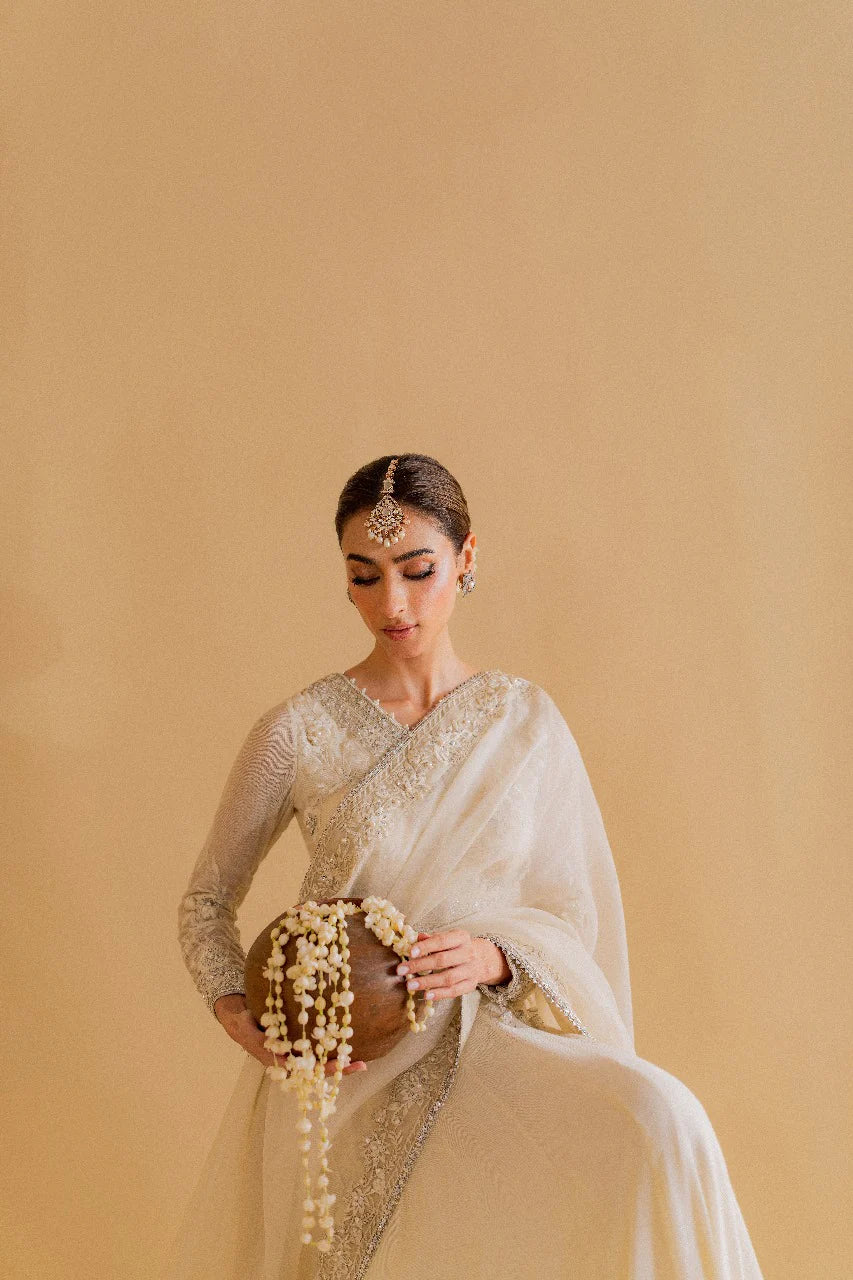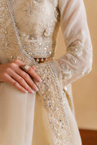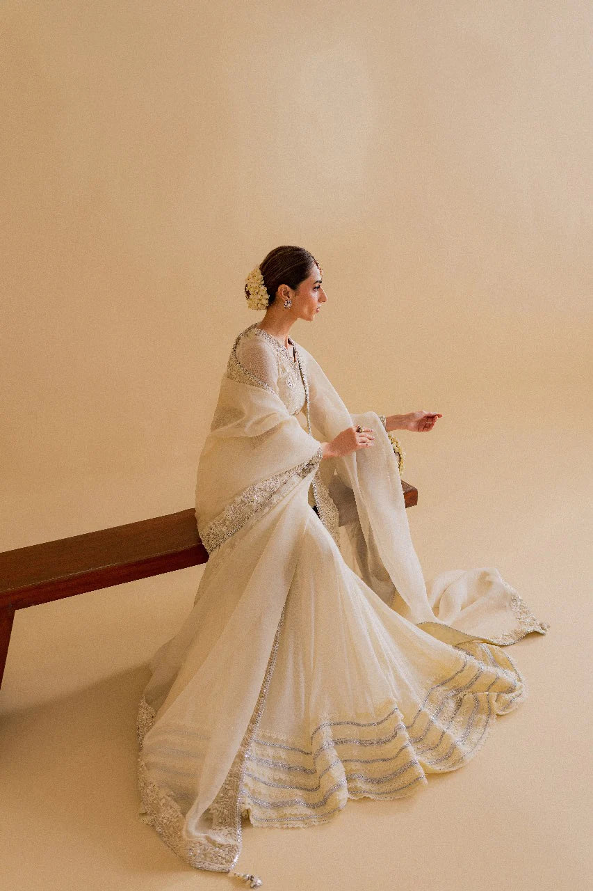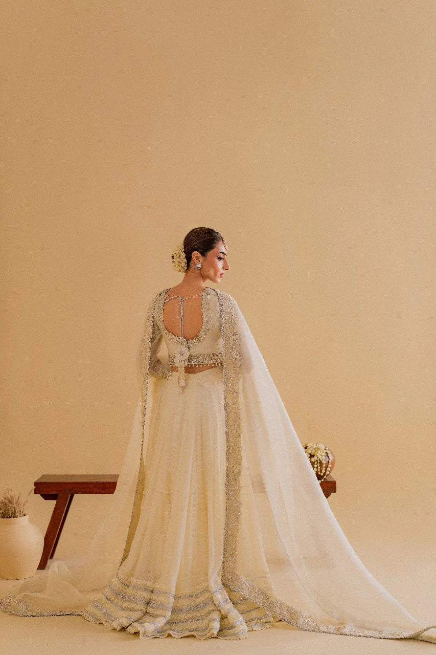 Draped in the serenity of white, this ethereal cotton net choli blooms with intricate handworked embellishments, featuring dapka and pearl accents that add a touch of glamour to timeless grace. The flowing lehenga, crafted to perfection, embodies purity and poise. Completing the look is a sheer organza dupatta, finished with lace and a beautifully embroidered border enhanced with delicate handworked detailing. An ensemble woven in elegance and romance, Shahnaz is a vision destined to enchant every gaze this wedding season.