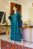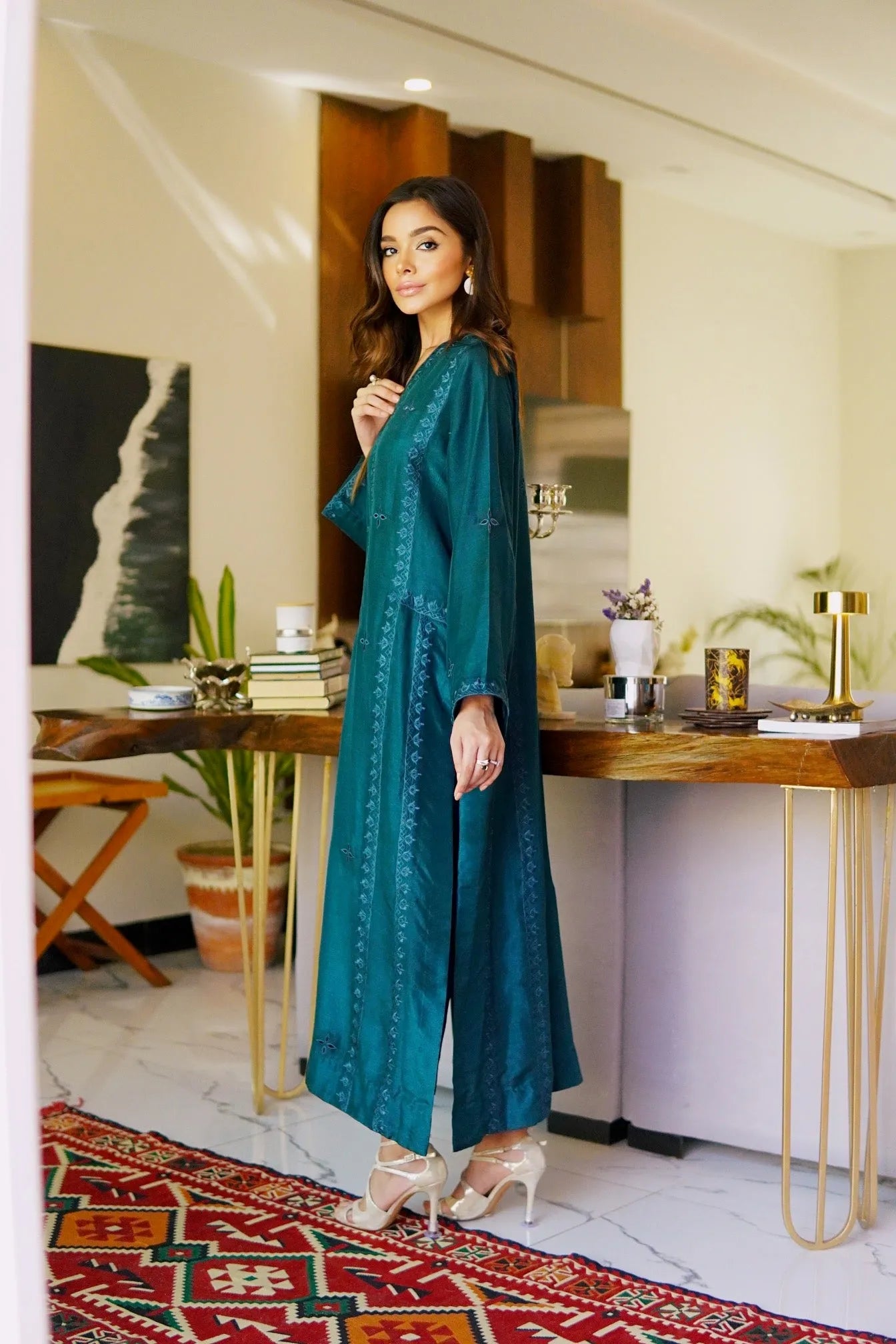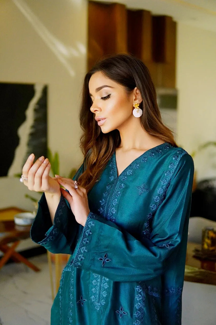 This elegant emerald green dinner outfit, crafted from pure raw silk, combines sophistication with intricate details. The embossed embroidery along the neckline, sleeves, and panels adds a luxurious touch, while the cutwork booti scattered throughout the fabric brings a subtle yet rich texture. The slim pants offer a modern silhouette, balancing the opulence of the top. To elevate the look further, you can pair the outfit with a delicate pure organza or chiffon dupatta. Can also be made in tea pink.