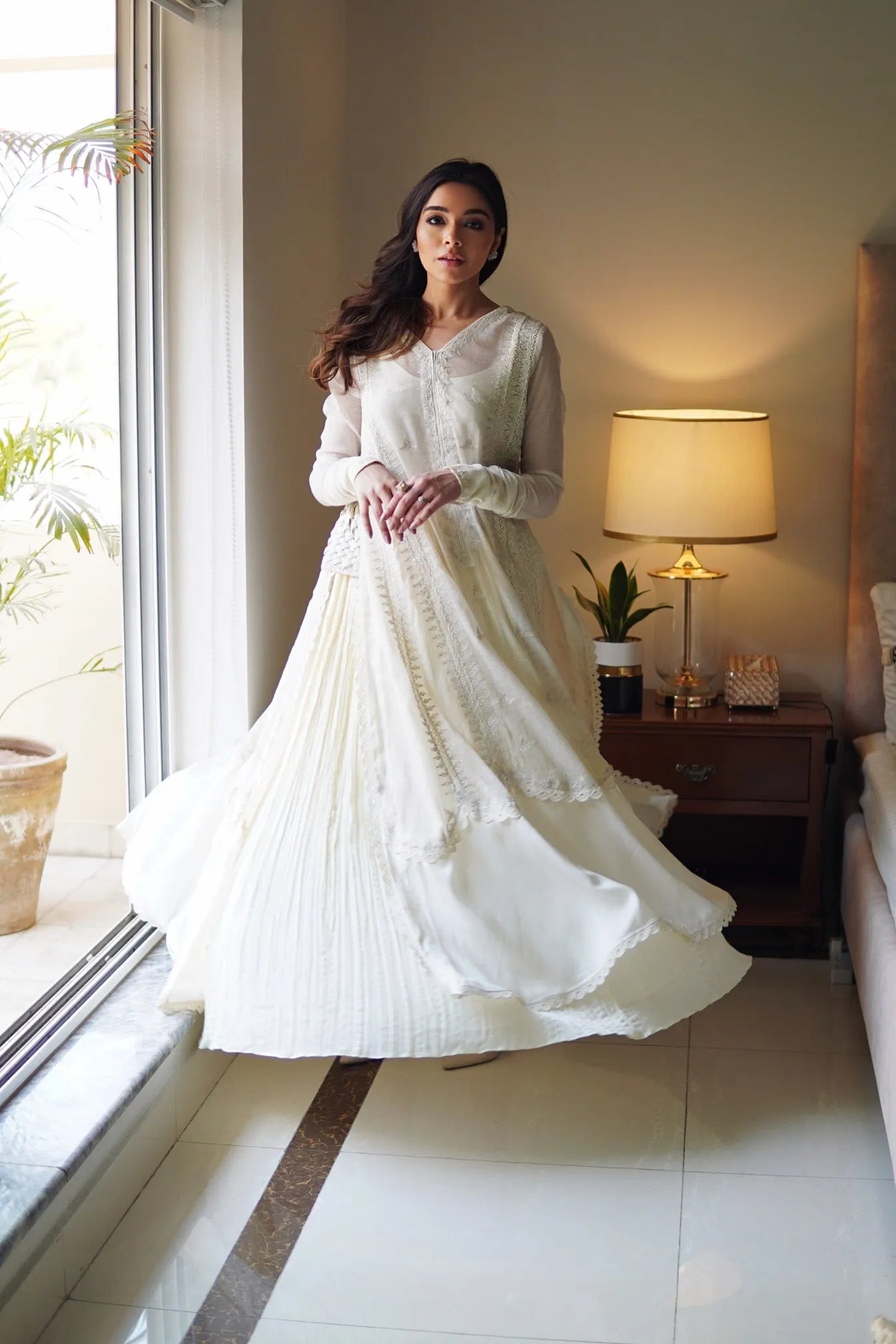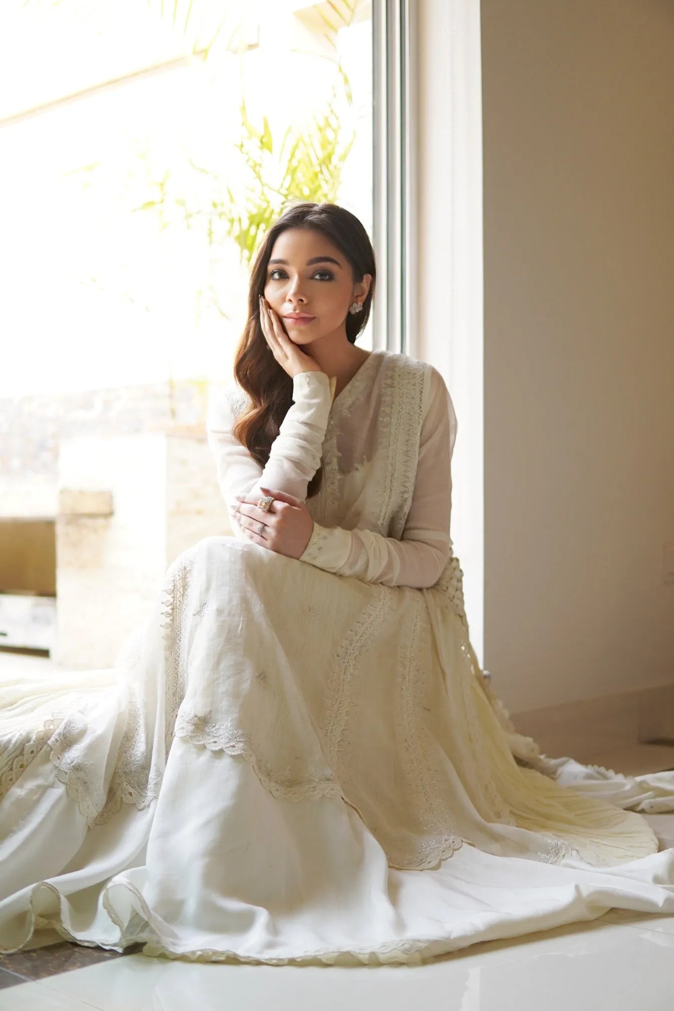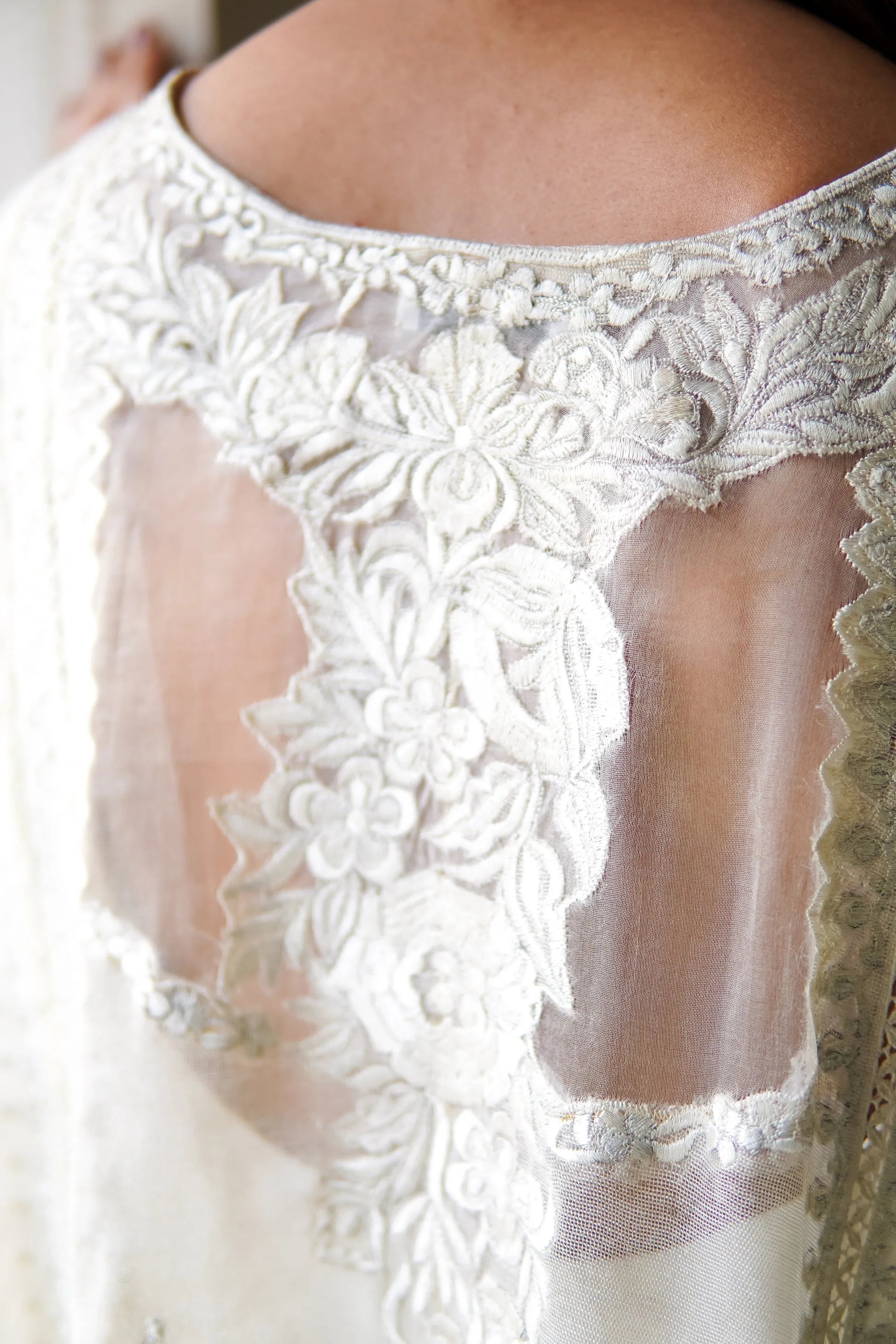 This traditional ivory paneled shirt exudes timeless elegance, with matching ivory embroidery meticulously adorning the panels, neckline, and sleeves. The intricate detailing elevates the design, creating a refined yet ethereal look. The churidar sleeves complement the classic silhouette, giving it an air of sophistication. To add a regal touch, the ghera is extended with a luxurious Korean raw silk border, adorned with delicate laces that enhance the richness of the outfit. The combination of soft ivory tones with the detailed embellishments brings a sense of royal grace, making it the perfect choice for a grand occasion.
