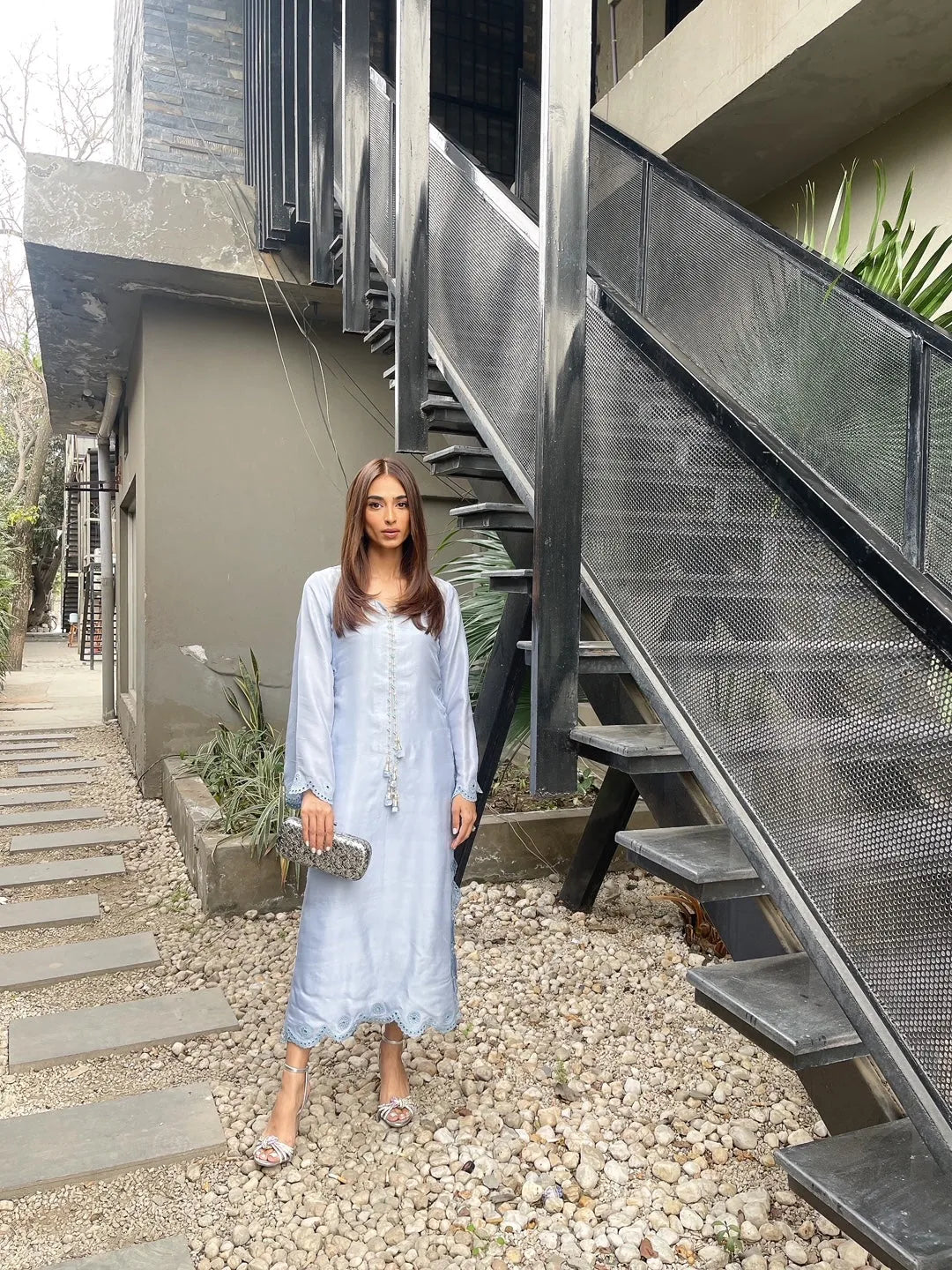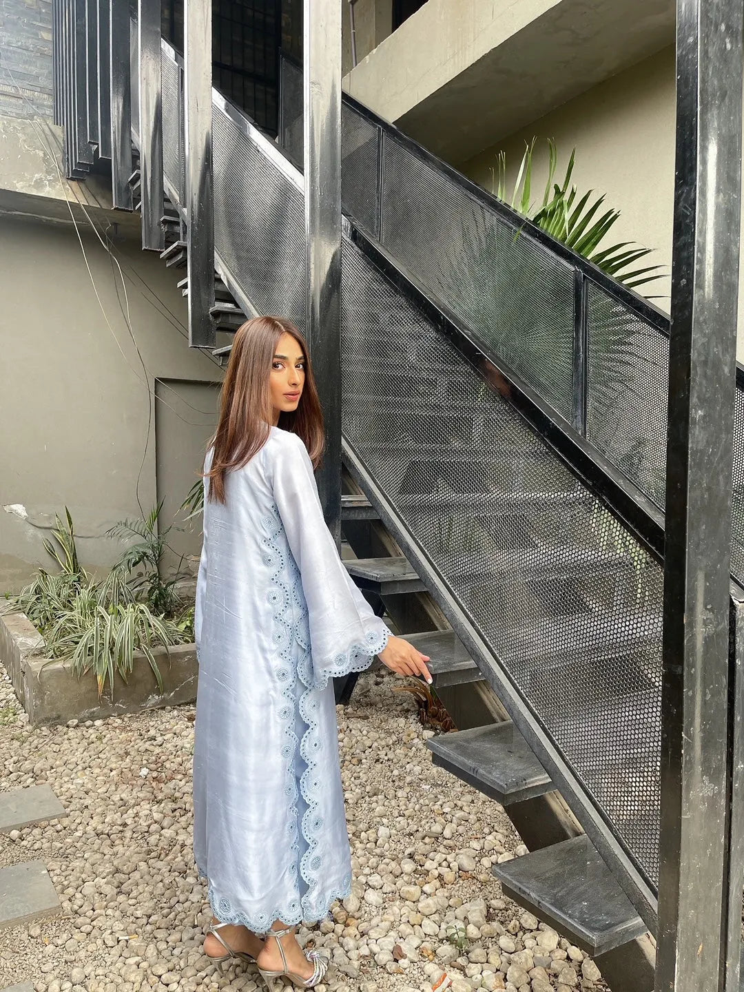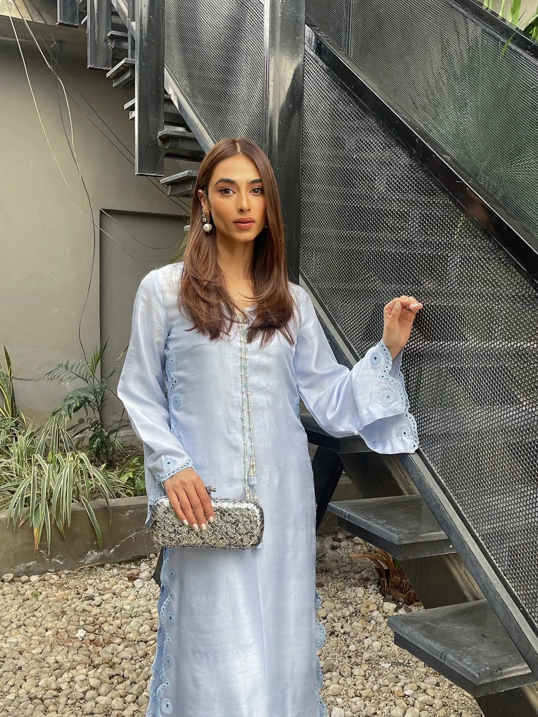 Set on a base of 60gram raw silk, this outfit has a pattern with scallops and cutwork embroidery. The sleeves are loose with a slit inside making them extra flowy, the neckline of this shirt is further adorned with a handmade tassel. This outfit has plain cigarette pants.