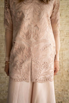A graceful fusion of structure and softness, this tea pink ensemble features a front-open jacket silhouette crafted from handwoven organza. Intricate cutwork embroidery adds a delicate, artisanal finish to the jacket’s fluid lines. Paired with pure raw silk box-cut trousers, the look balances elegance with modern refinement—perfect for formal occasions or elevated daytime events.