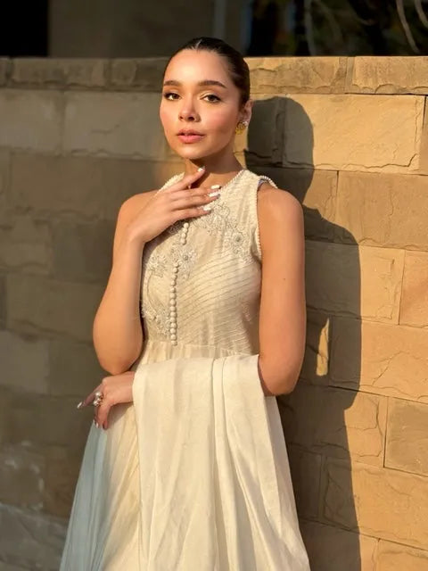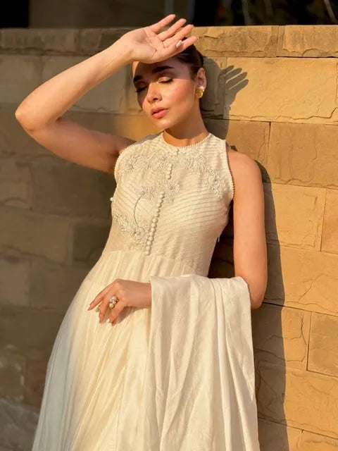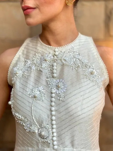 This ivory khadi net pishwas features delicate hand embroidery and soft embellishments on a flowing full length silhouette. Paired with a lightweight cotton net dupatta, it offers a graceful, refined look perfect for daytime events or intimate celebrations. It feels like a gentle nod to tradition with a touch of quiet luxury. The full length silhouette flows beautifully, while the hand embroidery and soft embellishments add just the right amount of detail without overwhelming the look.