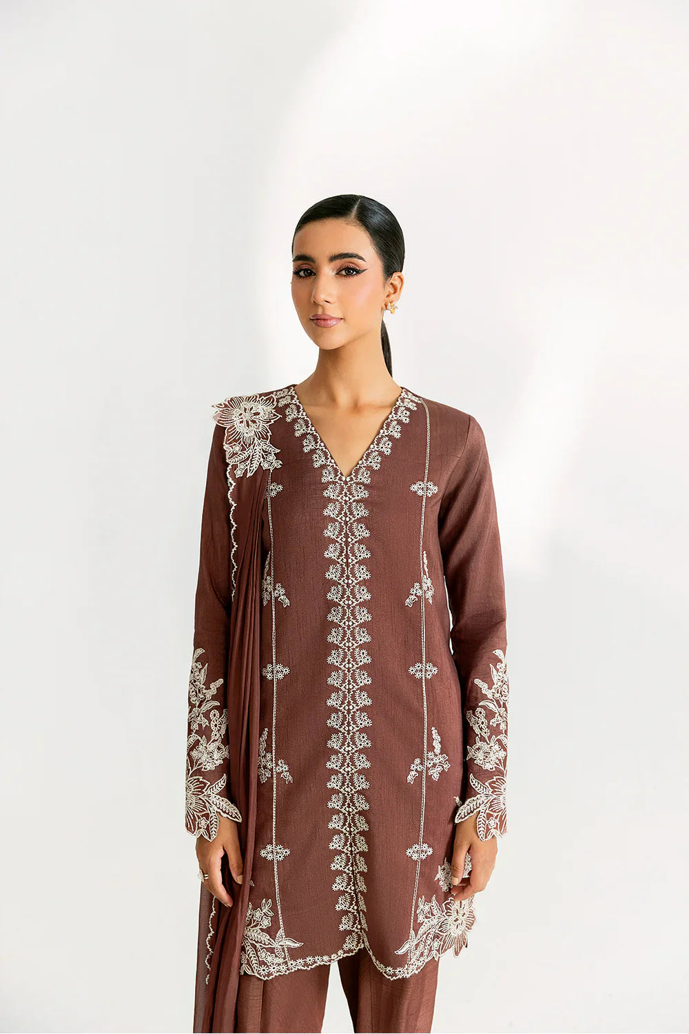 Crafted from luxurious Korean raw silk, the dress features intricate resham embroidery that highlights its timeless elegance. The look is paired with a graceful silk dupatta, adorned with resham embroidery, adding refinement and charm. A unique detail, the 3D motif on the sleeve, lends a modern artistic touch, making the outfit both classic and contemporary.