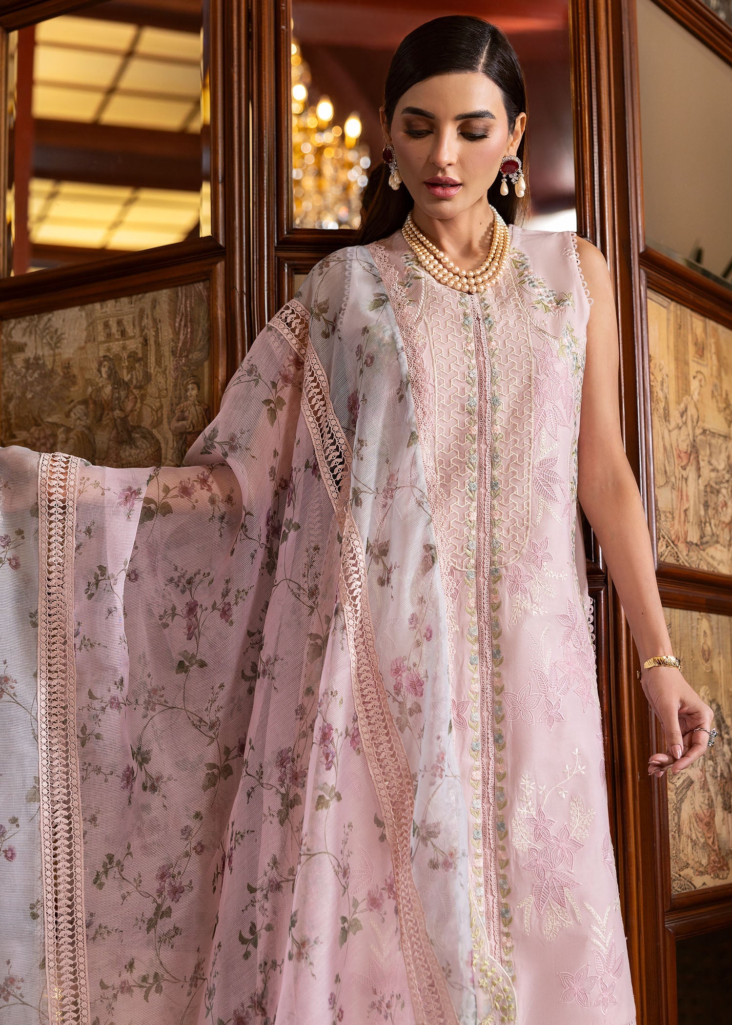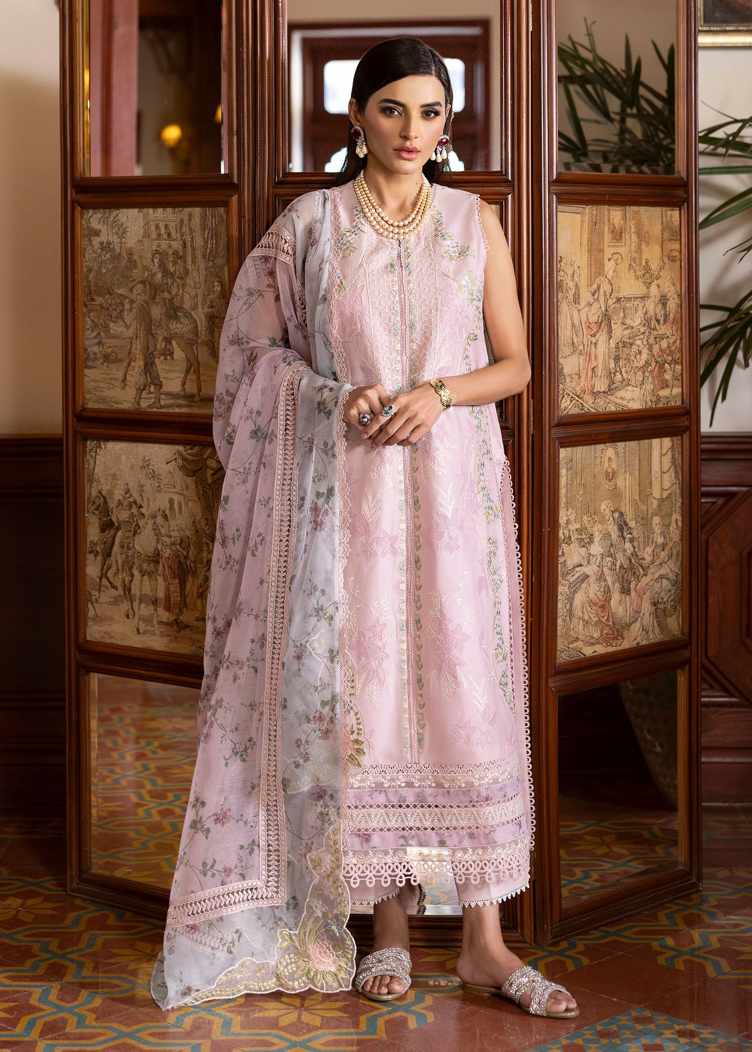 A design that is the epitome of feminine grace, a neckline embroidered in blooming lotuses and lilies in shades of lavender and blush like a soft summer morning on a luminous sky blue cutwork canvas. The blue cutwork front is finished with a flowy border that connects it to the ivory daman Feminine and elegant this tonal design is a head turner! The duppatta, a breezy cotton net is hand printed with bouquets and Ribbons.