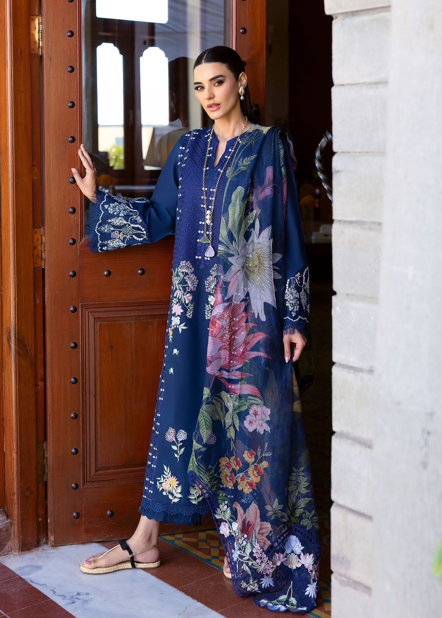 The dupatta is cotton net printed in bold flora finished with rounded cutwork pallus.