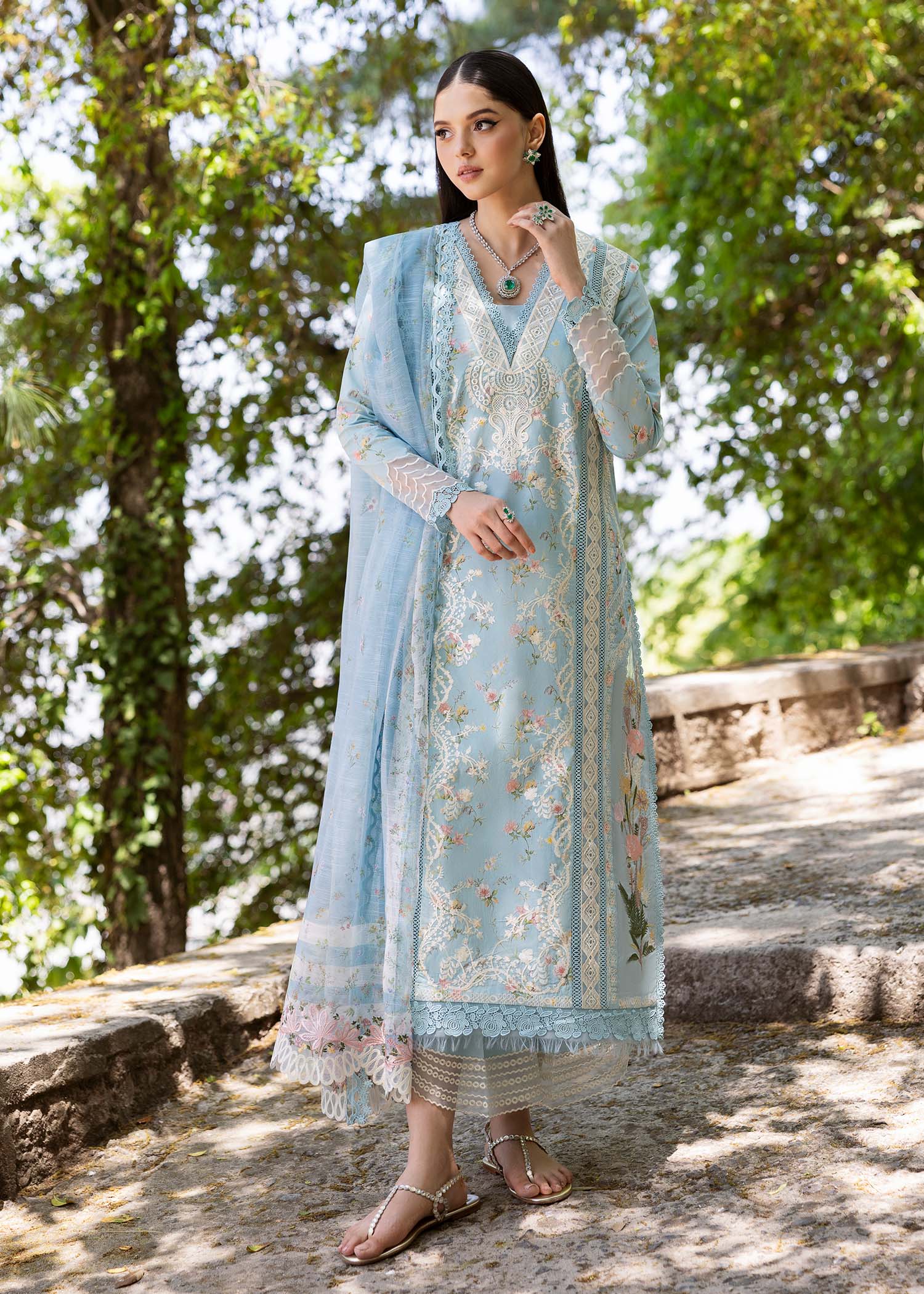 A design that is the epitome of feminine grace, a neckline embroidered in blooming lotuses and lilies in shades of lavender and blush like a soft summer morning on a luminous sky blue cutwork canvas. The blue cutwork front is finished with a flowy border that connects it to the ivory daman Feminine and elegant this tonal design is a head turner! The duppatta, a breezy cotton net is hand printed with bouquets and Ribbons.