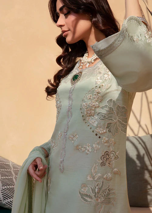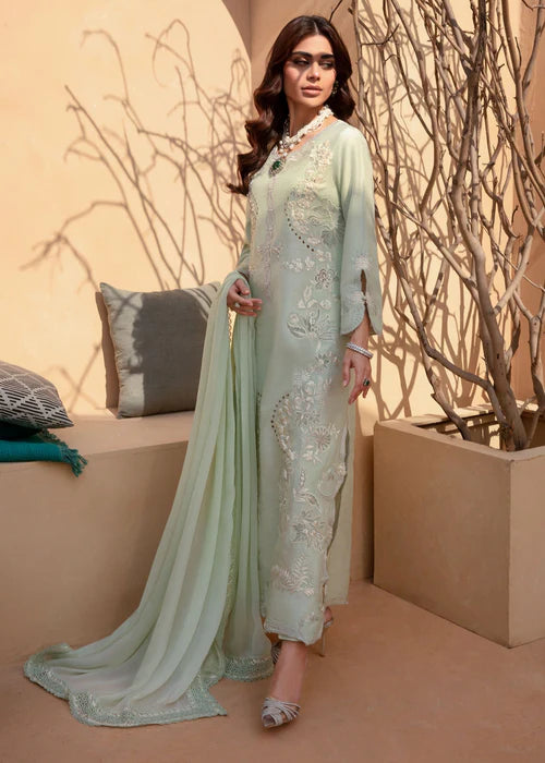Additional Description: A dazzling pastels jade ensemble with spectacular accents and flesh out floral craftsmanship. Perfect for effortless grace and traditional splendor. Shirt Length: 54 Pants Length: 37