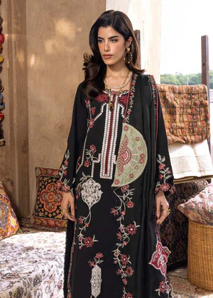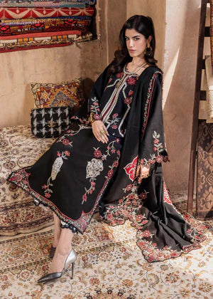 A masterpiece that exudes an aura of refined elegance and quiet luxury. Draped in an ebony khaddar canvas, this design is adorned with meticulously crafted ivory single taar embroidered borders reminiscent of old Kashmiri work, brought to life with delicate floral motif vines in hues of warm pinks and whispers of scarlet.