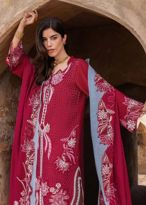 Submerge yourself in this stellar sophistication, where a rapturing Ruby textured with schiffli cutwork embroidery canvas transforms into a winter masterpiece. Adorned with bold organza floral embroideries in tonal pink shades with Ferozi blue accents. The dori work outlining the embroidered florals elevates the ensemble and creates a 3D texture. This ensemble is a harmonious blend of artistry and refinement. The design embraces the spirit of modern elegance, with finely embroidered borders in organza at the hem echo the refined allure of winter's beauty. Completing this modern sophisticated ensemble is a luxurious woollen shawl, richly adorned with a striking floral border on organza that embodies the elaborate allure of winters. Feminine yet unapologetically bold! This design is the epitome of understated glamour, that makes a statement.