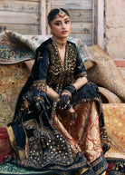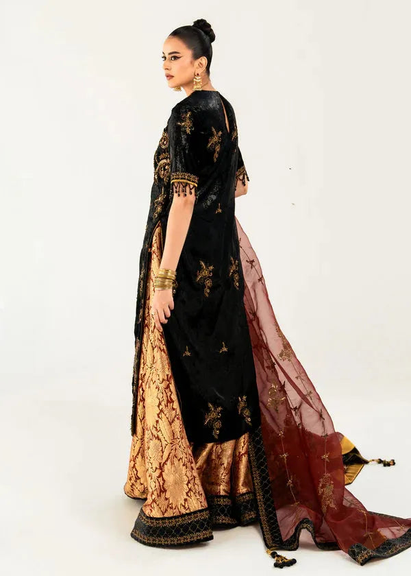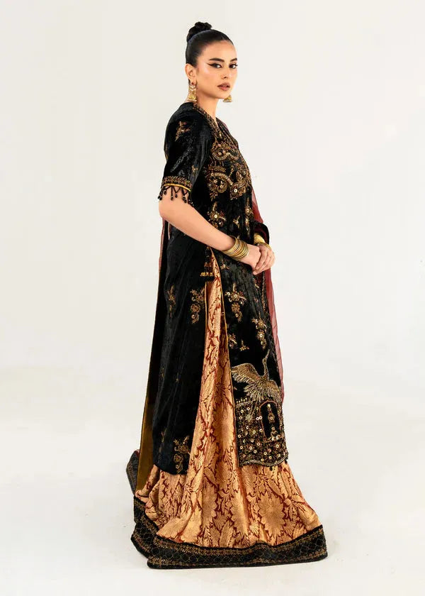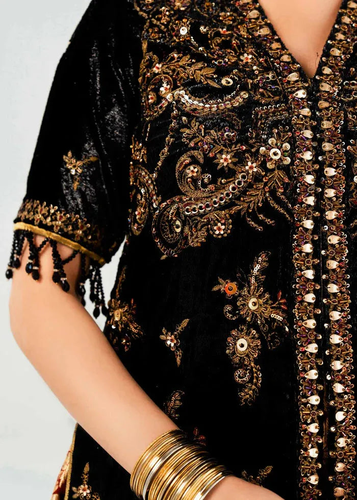 A luxurious, open-front shirt crafted from black shimmer velvet and intricately embellished with crystal-cut beads and Swarovski crystals. The design showcases a pattern-aligned dabka edging, with layers of meticulously placed baitki in a crane motif. The gown is adorned with short sleeves, each accented by long, black tassels for a touch of drama. Paired with it are three-panel jamawar azaar pants, featuring a black shimmer velvet base with delicate embroidery. The ensemble is completed by an embroidered organza dupatta, framed by a four-sided velvet border.