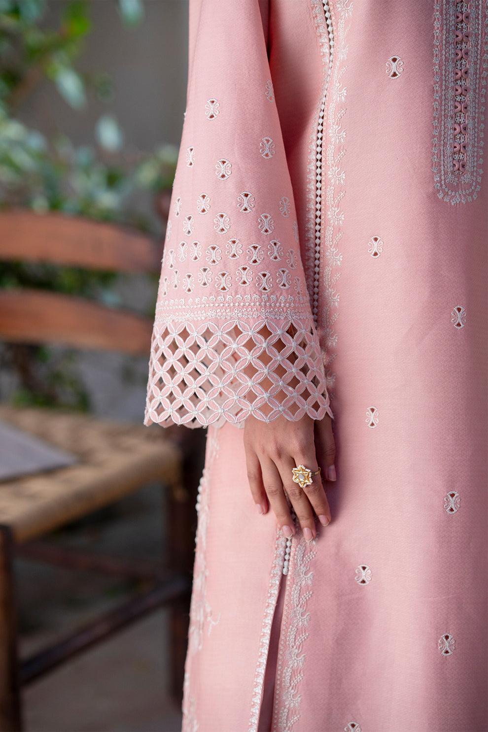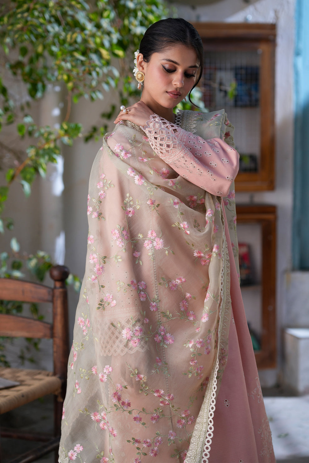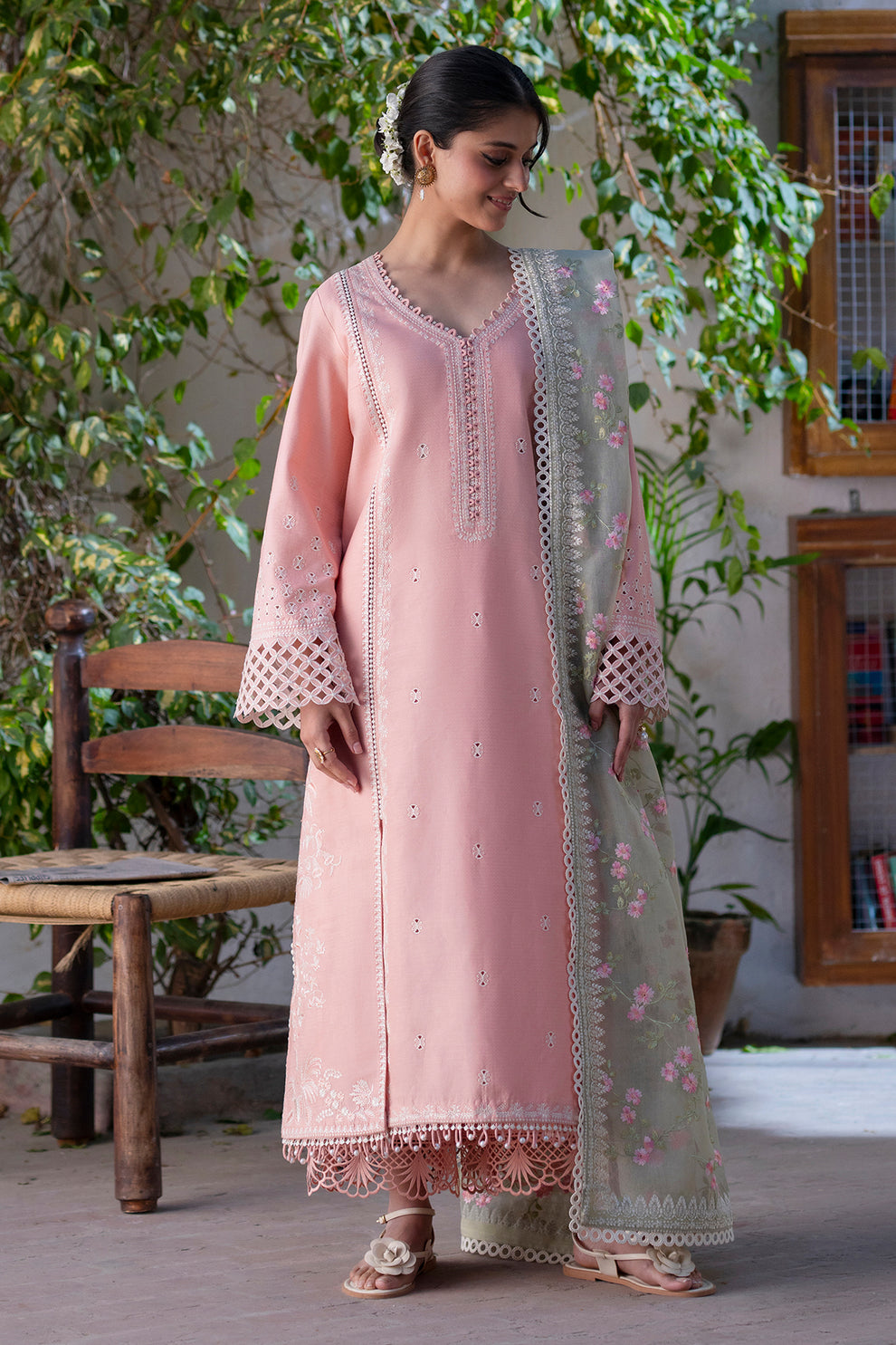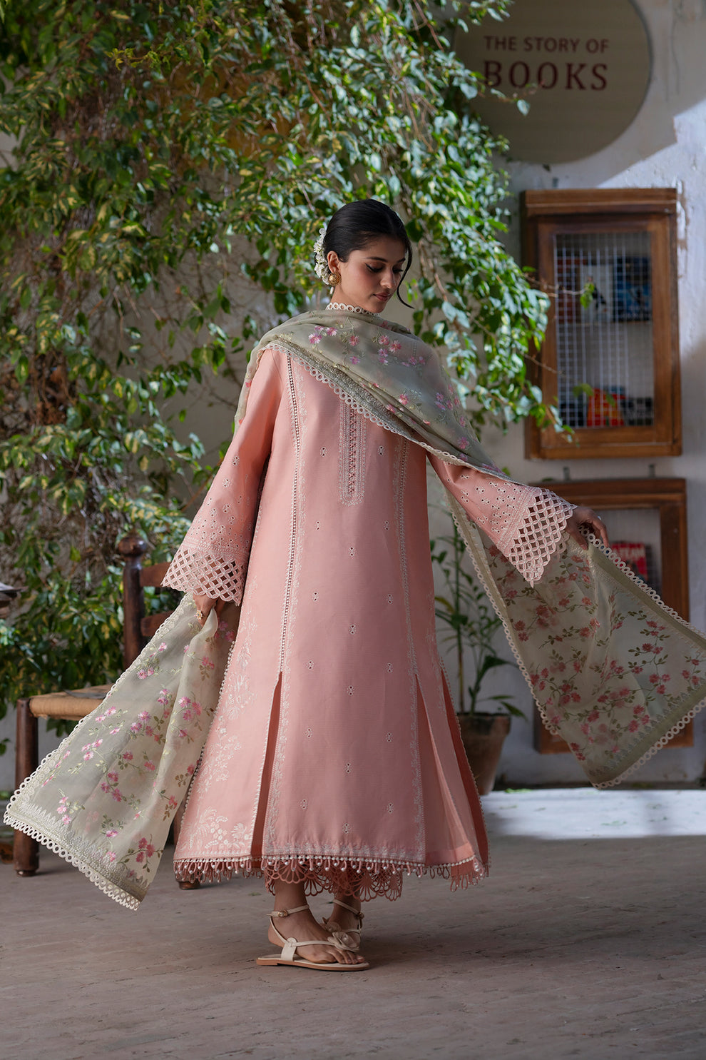 A dreamy pastel peach kurta adorned with delicate embroidery and intricate cutwork lace on the sleeves. Paired with a soft green dupatta featuring dainty floral embroidery and lace edging, this ensemble beautifully blends sophistication with a feminine charm.