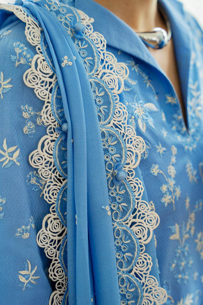 Denim blue, pure cotton round hem, jacquard short shirt with a nautched collar with bell, scalloped sleeves. Floral Embroidery details finesse the shirt and decorate it thoroughly with added lace detailing.