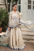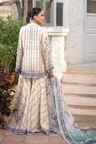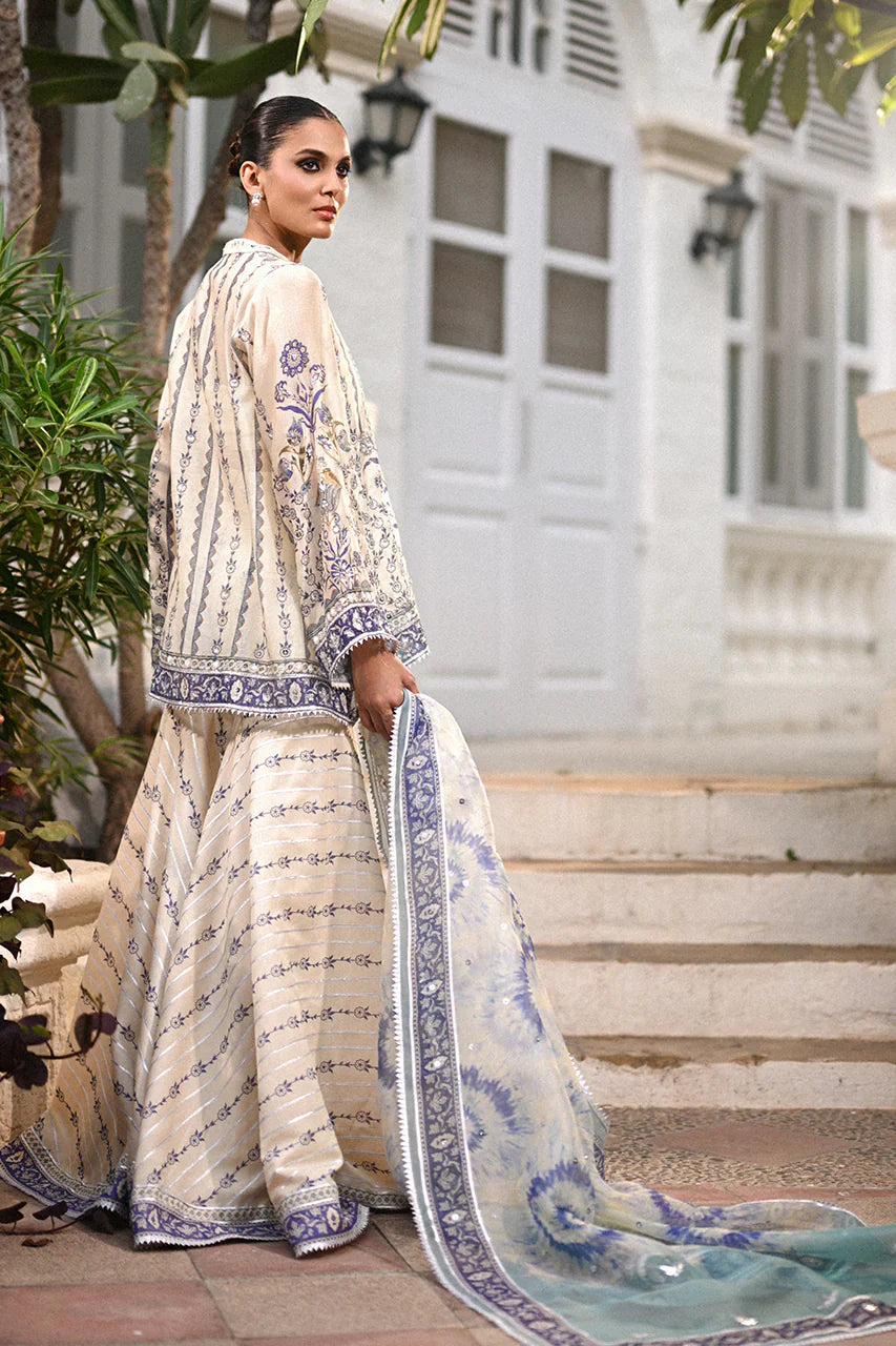 This festive ensemble radiates sophistication in a delicate palette of ivory, indigo, and muted teal. The cotton net kurta is intricately embellished with shimmering gota embroidery in floral and vine motifs, layered over a matching pure rawsilk tube top for a contemporary touch. It is paired with a voluminous khaddi silk gharara, expertly tailored and accented with fine vertical gota detailing and a contrasting border. A gossamer organza dupatta, printed in a soft watercolor blend of complementary hues, completes the look with effortless grace.