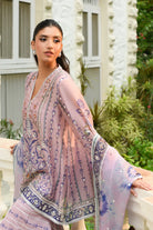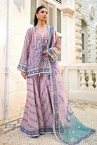 This festive ensemble radiates sophistication in a delicate palette of lilac, periwinkle, and muted teal. The cotton net kurta is adorned with intricate gota embroidery in floral and vine motifs, layered over a matching pure raw silk tube top for a contemporary touch. It is paired with a voluminous khaddi silk gharara, expertly tailored and accented with fine vertical gota detailing and a contrasting border. A gossamer organza dupatta, printed in a soft watercolor blend of complementary hues, completes the look with effortless grace.