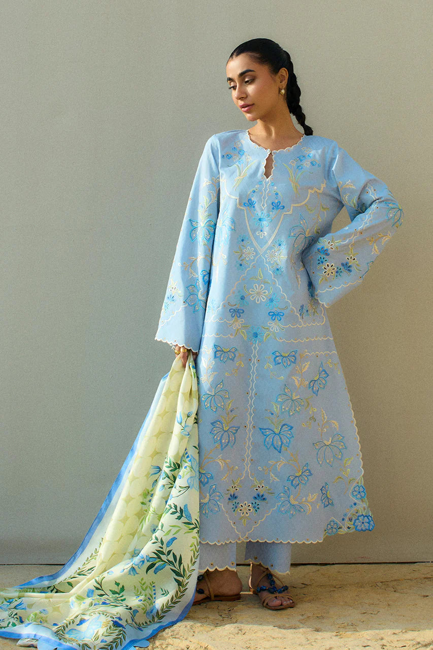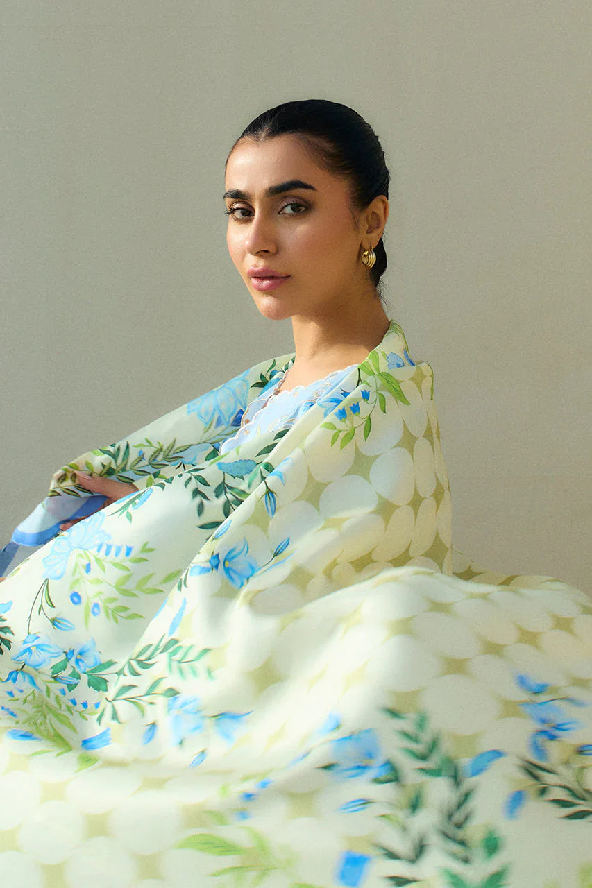 A powder blue jacquard lawn canvas is rendered with our signature floral embroidery in hues of tea green, ivory, and azure. Intricate eyelet details adorn the scalloped hem and matching culottes. The outfit is paired with a painterly printed ivory pure medium silk dupatta paying ode to a whimsical botanical garden.
