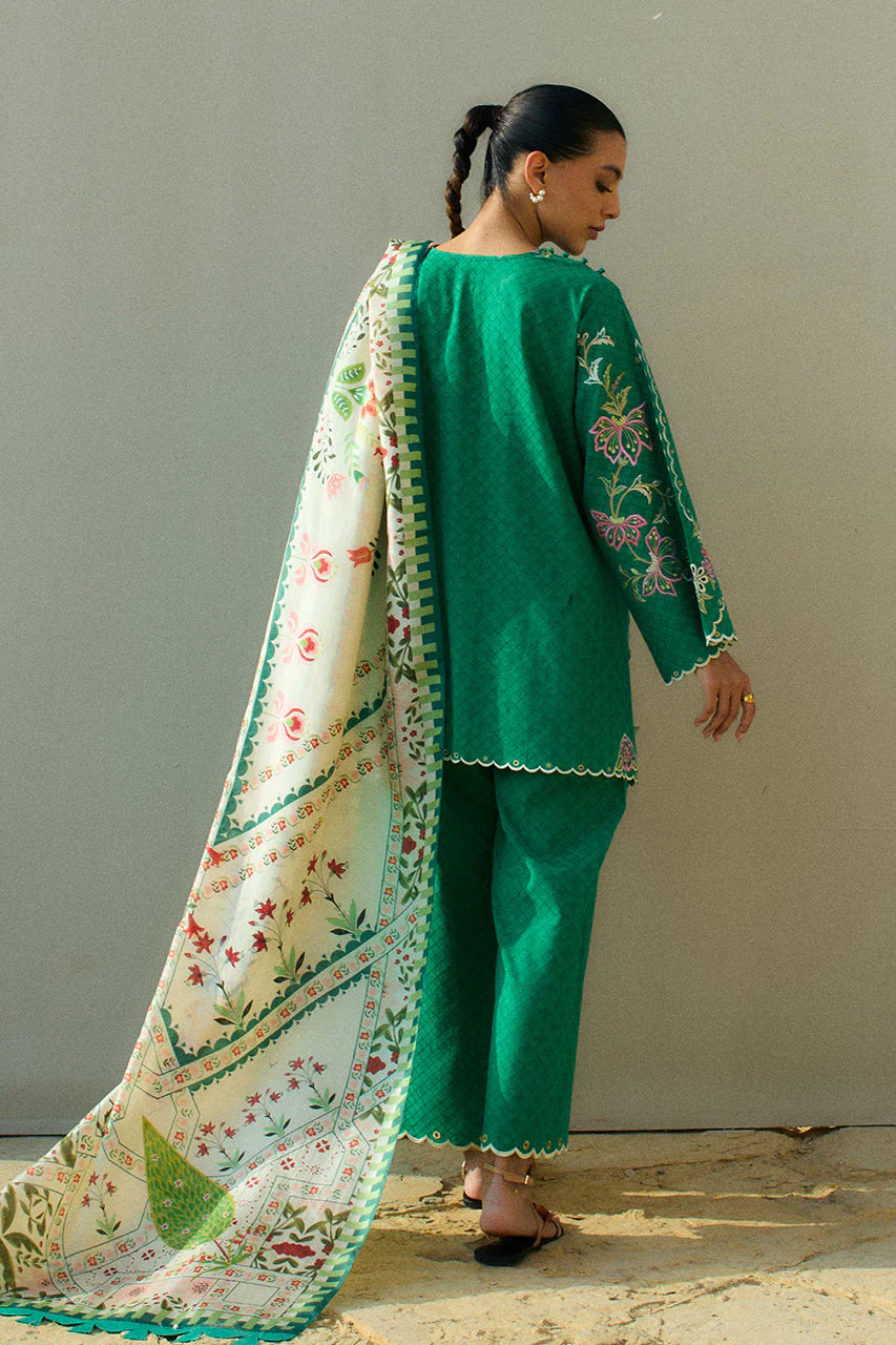 A forest green jacquard lawn base is rendered with our signature floral embroidery in hues of blush pink, ivory, and sage green. Intricate eyelet details adorn the scalloped hem and matching culottes. The outfit is paired with a painterly printed ivory pure medium silk dupatta paying ode to a whimsical botanical garden.