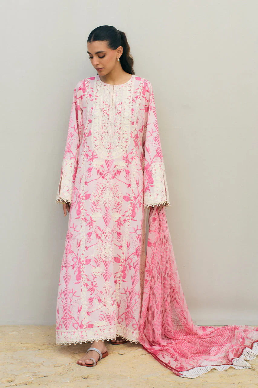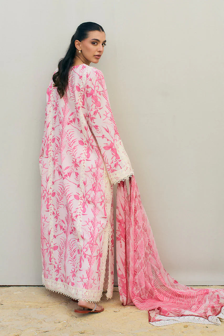 A painterly printed cherry blossom hued jacquard lawn shirt is rendered with exquisite aari embroidery. The delicate embellishment, with lace finishing, frames the neckline, hem and sleeves. Paired with a quintessential printed chiffon dupatta in deeper shades of cherry blossom and matching printed culottes with lace finishing.
