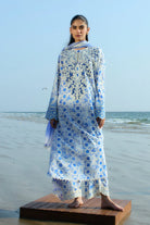 A timeless design in striking ivory and periwinkle hues comes to life on this elegant, aari embroidered jacquard lawn shirt and shalwar. An expansive applique neckline and embroidered ombre sleeves perfectly complement the dainty floral embellishments on the scalloped shalwar. Paired with a matching tie and dye inspired printed pure chiffon dupatta with lace finishing.