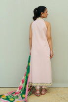 A tea pink jacquard lawn kurta is rendered with artful eyelet embroidery in hues of spring with cutwork borders for the neckline and hem. Paired with a painterly printed, multi hued pure medium silk dupatta and matching jacquard lawn trousers with eyelet detailing on the hem.