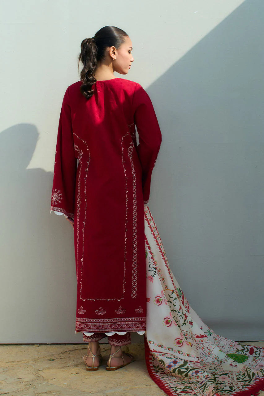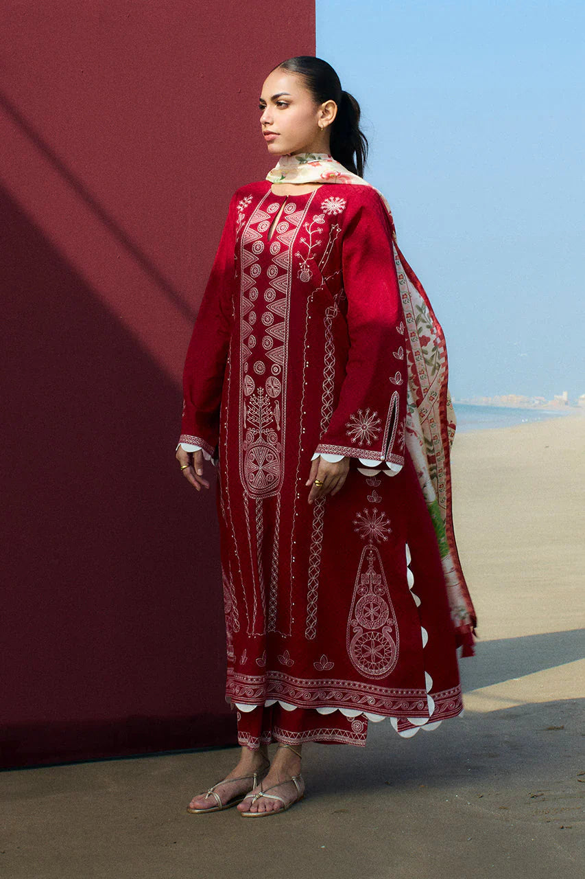 Rich heritage motifs meet contemporary patterns in this crimson hued jacquard lawn shirt and culottes, rendered with delicate kantha embroidery in an elegant beige hue. Paired with a rich multi hued pure medium silk dupatta in our signature painterly print.