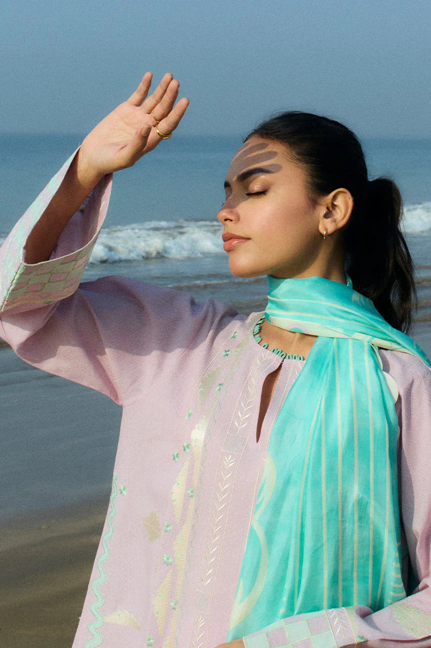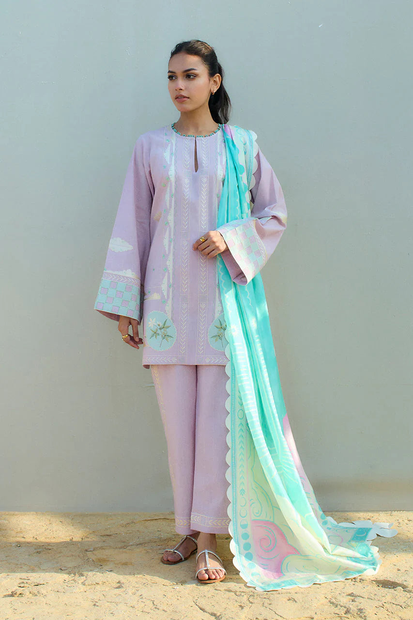 An elegant mix of resham and applique embroidery adorns a lilac hued jacquard lawn shirt and culottes. A floral bouquet in the most subtle hues of ivory and moss green is embellished on the hem with checkered ice blue applique elevating the sleeves. Paired with an ice blue pure medium silk dupatta featuring an ethereal print in shades of pastel.