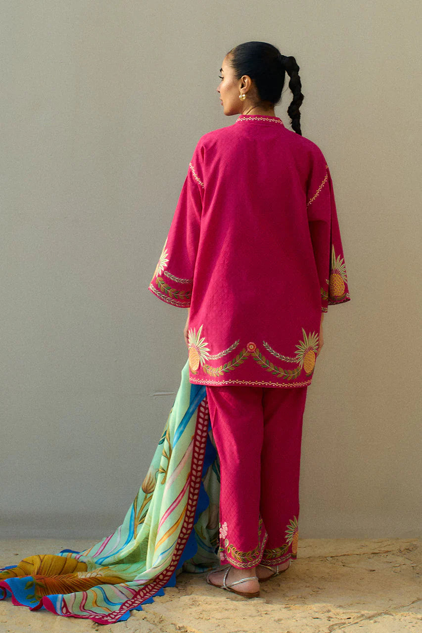 A tropical dream comes to life on a fuchsia hued jacquard lawn shirt and shalwar. Embroidered with nature's elements and playful flamingos, the set is balanced with intricately embroidered borders and lush green vines on the neckline, sleeves, and the hem of the culottes. Paired with a pure medium silk dupatta with a painterly floral print in mint, tangerine, and fuchsia tones.