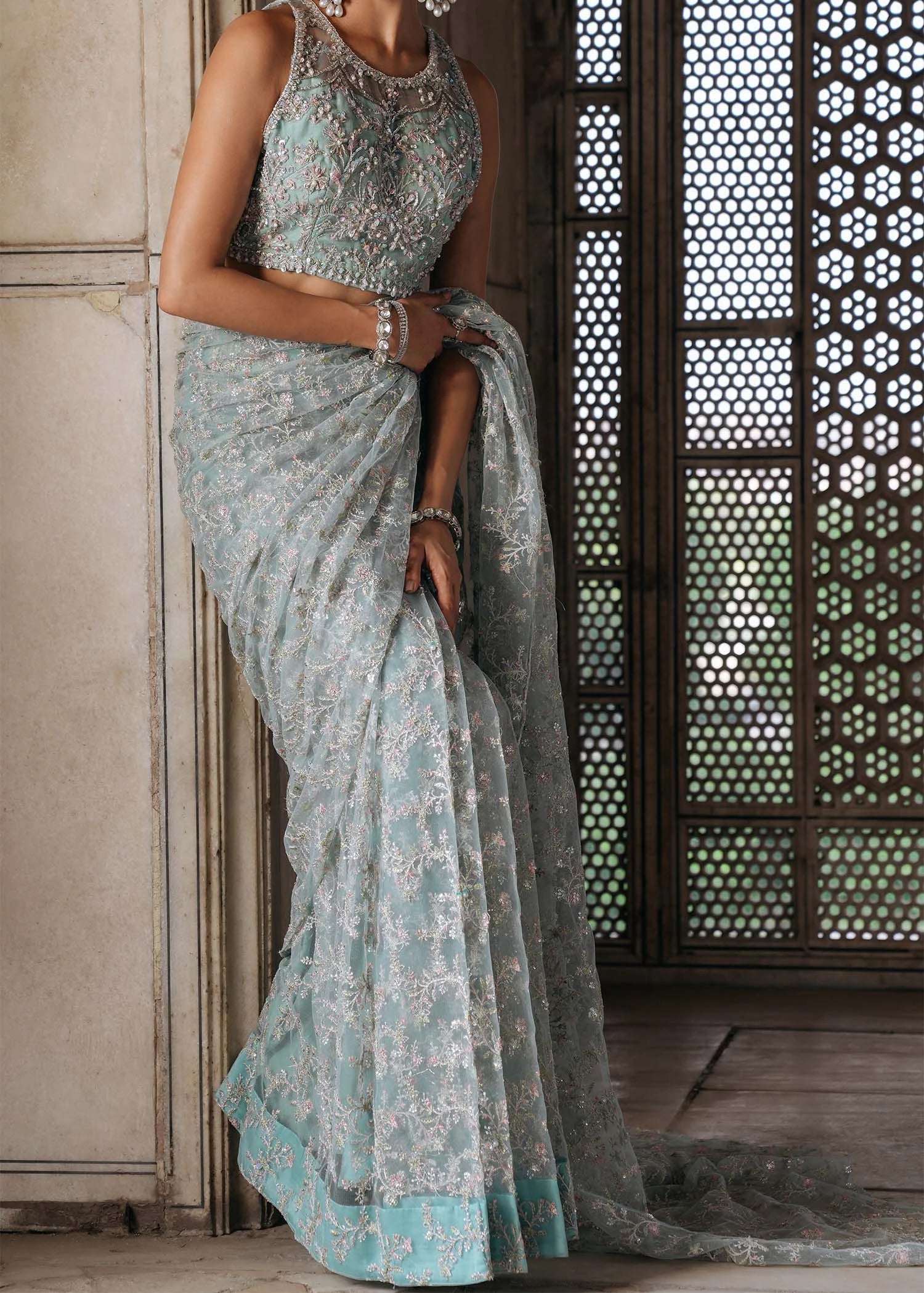 A masterpiece of elegance, this net saree is adorned with exquisite jaal embroidery and delicate handwork, creating a timeless and luxurious appeal. The ethereal drape is paired with a statement blouse, richly embellished with intricate ada work and fine detailing, offering a perfect blend of tradition and sophistication. Designed to exude grace and grandeur, this ensemble is an ideal choice for weddings, festive occasions, or any moment that calls for refined opulence.