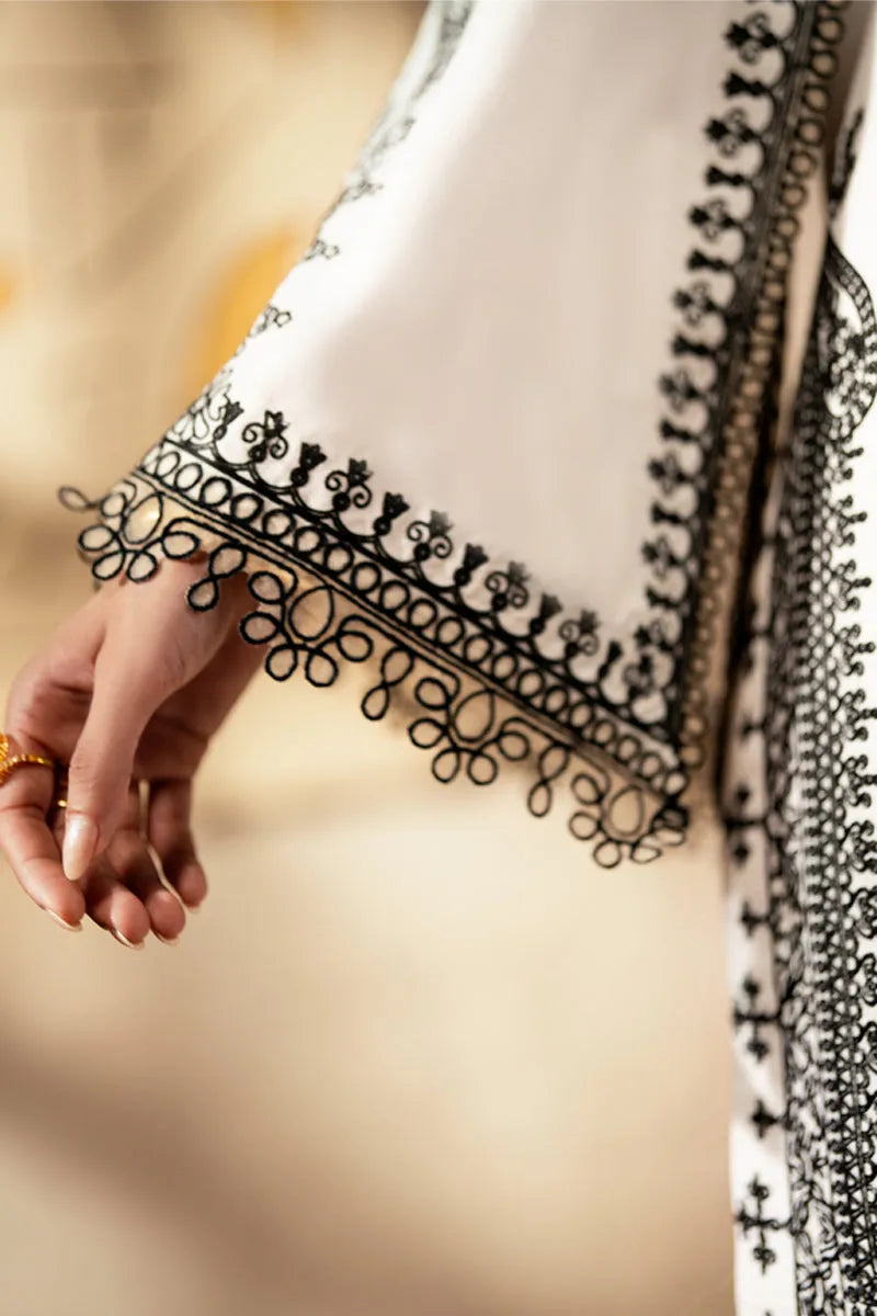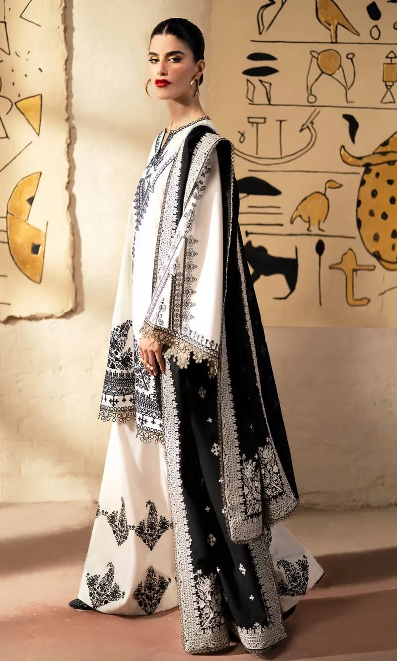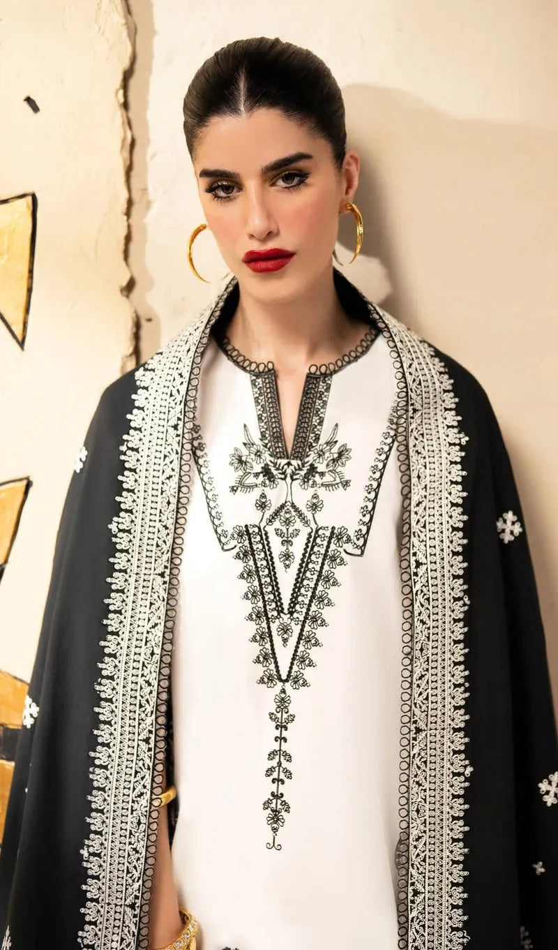 A timeless monochrome masterpiece — this ensemble features a crisp white base beautifully contrasted with intricate black embroidery along the shirt and trouser hems. Paired with a matching black dupatta adorned with delicate embroidery, the look exudes effortless elegance and classic sophistication. Perfectly balanced and striking in its simplicity, this outfit redefines understated style with every stitch