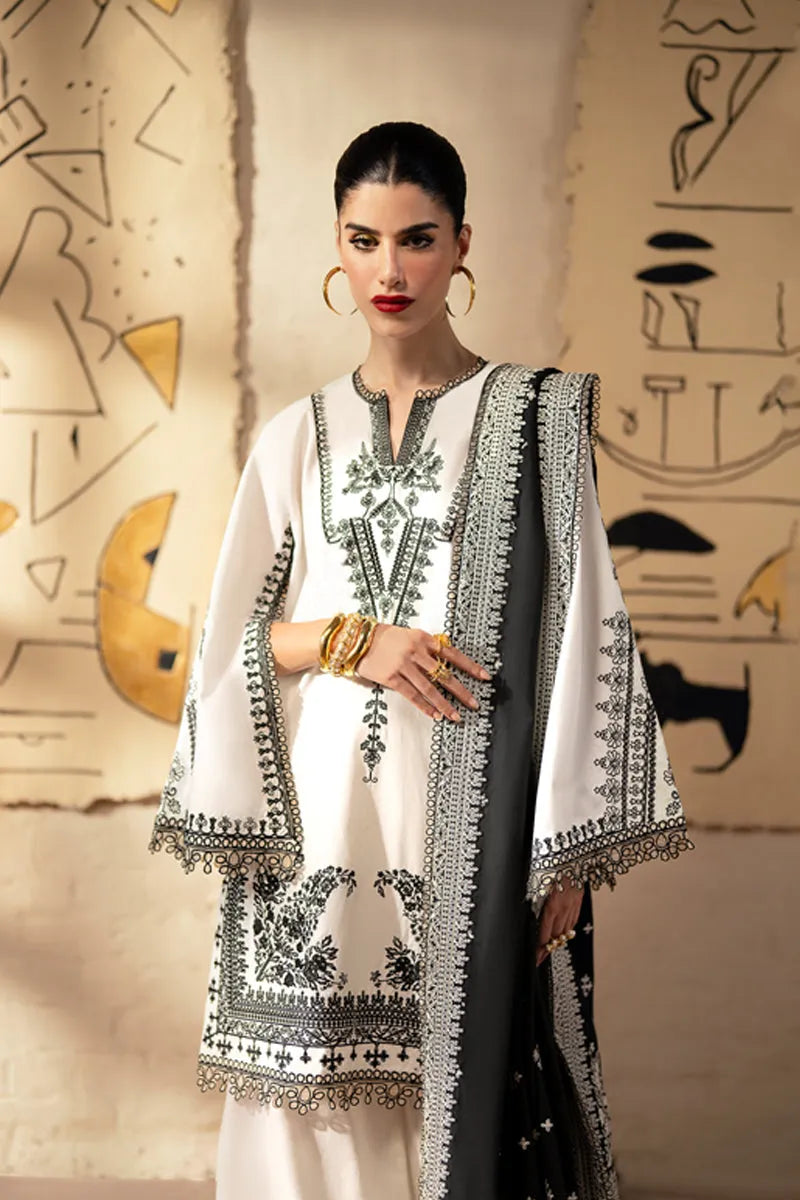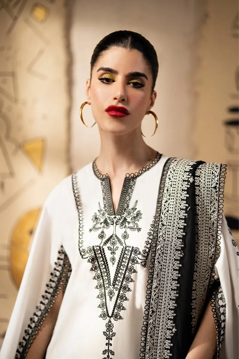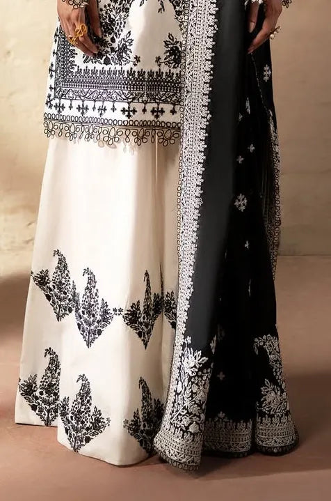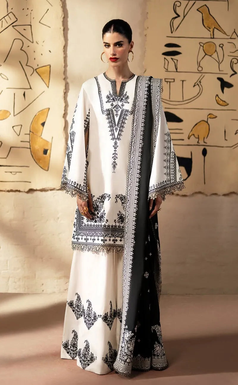 A timeless monochrome masterpiece — this ensemble features a crisp white base beautifully contrasted with intricate black embroidery along the shirt and trouser hems. Paired with a matching black dupatta adorned with delicate embroidery, the look exudes effortless elegance and classic sophistication. Perfectly balanced and striking in its simplicity, this outfit redefines understated style with every stitch