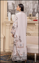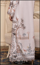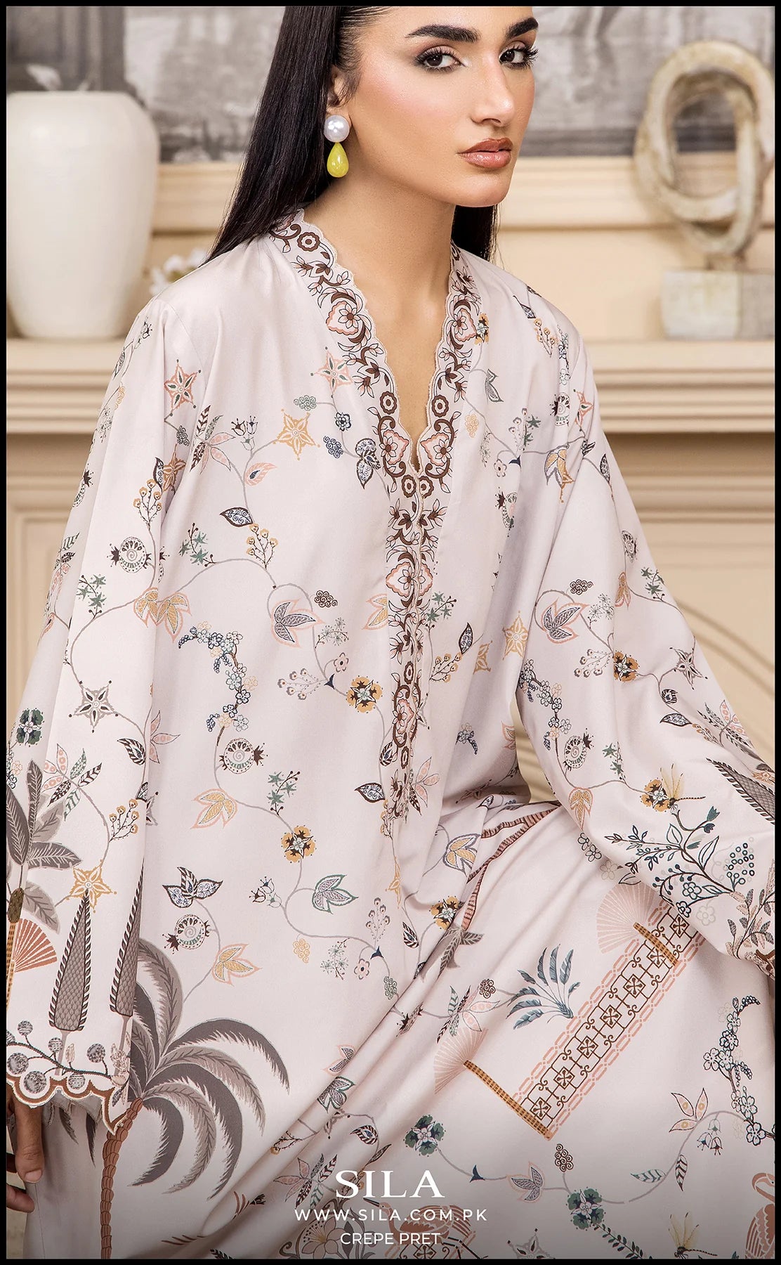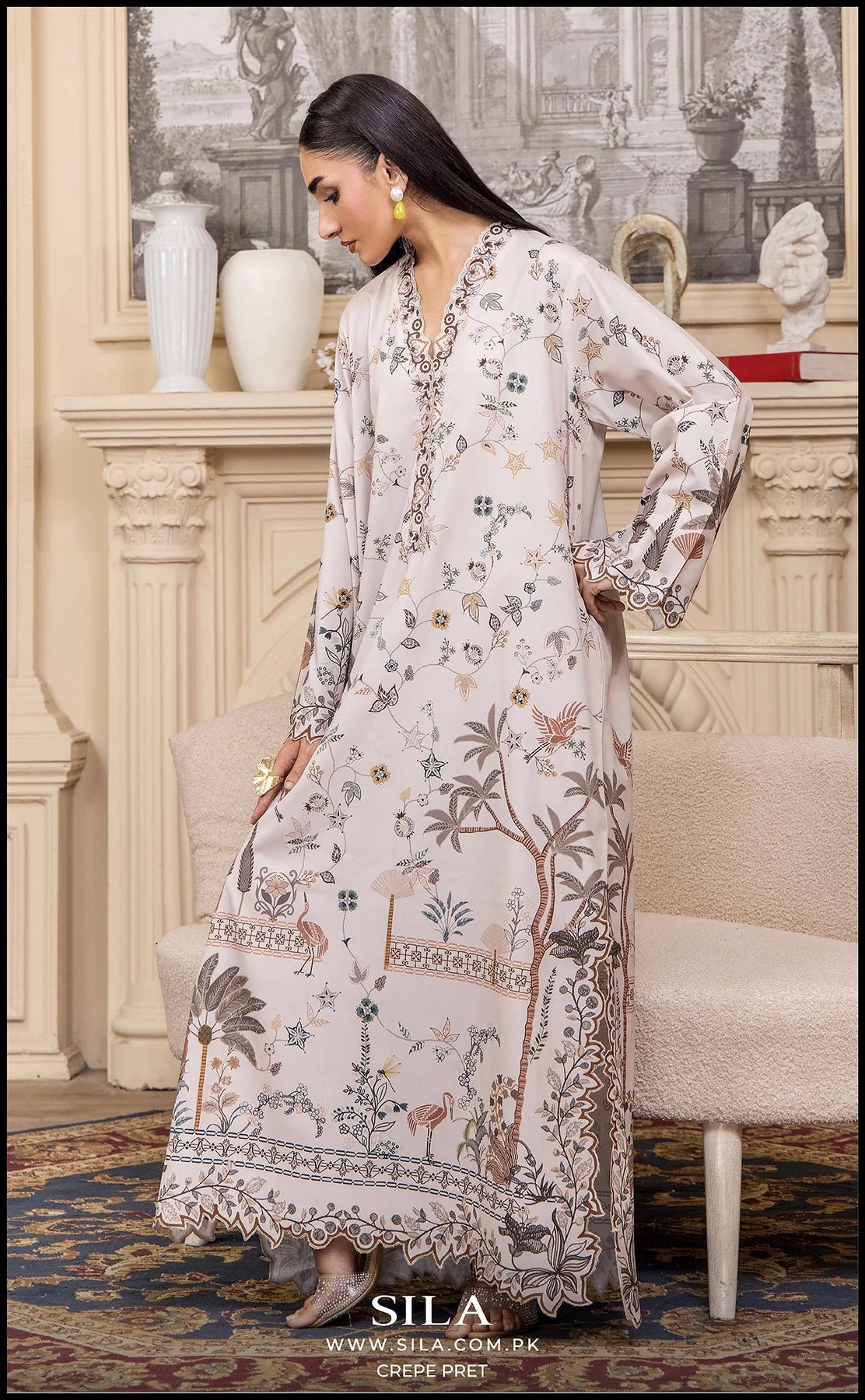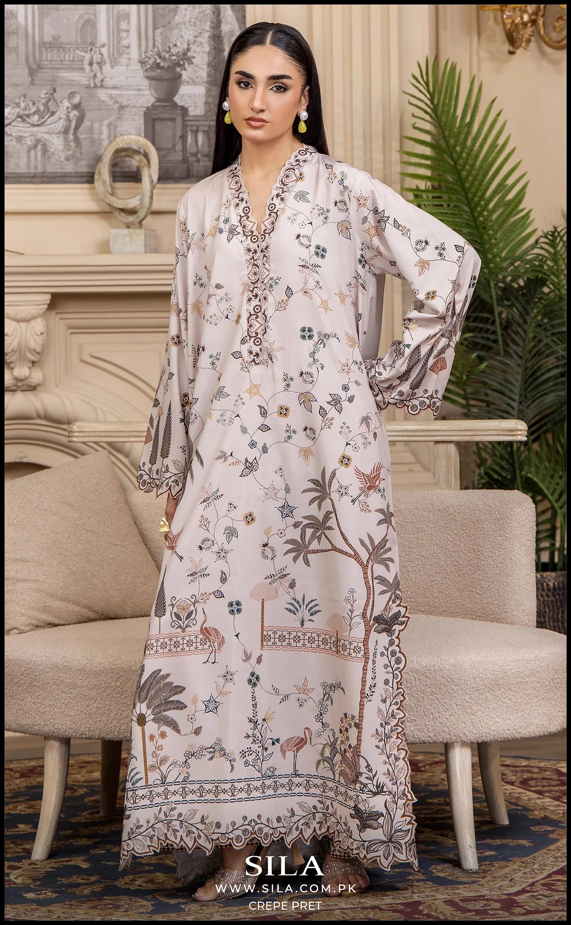This beautiful 2-piece ensemble is crafted from luxurious, flowing printed crepe fabric in a delicate, light beige or off-white shade. The long-length shirt features an exquisite digital print, showcasing a picturesque scenic design with motifs of stylized trees, birds, and flora in soft, earthy tones of brown, olive, and terracotta. The V-neckline is enhanced with subtle embroidered detailing, and the hemline and sleeves are finished with elegant scalloping. The set includes a matching trouser to create a refined, ready-to-wear look, perfect for a sophisticated daytime or casual semi-formal event.