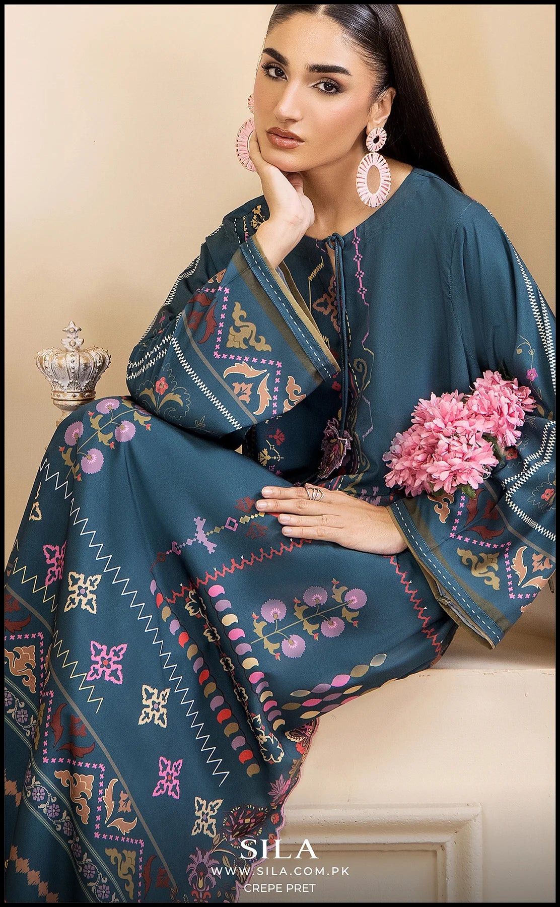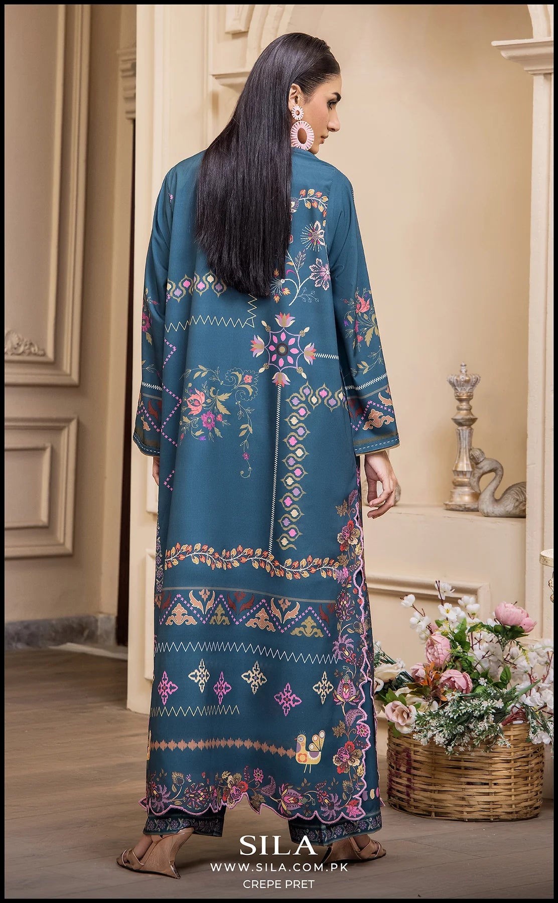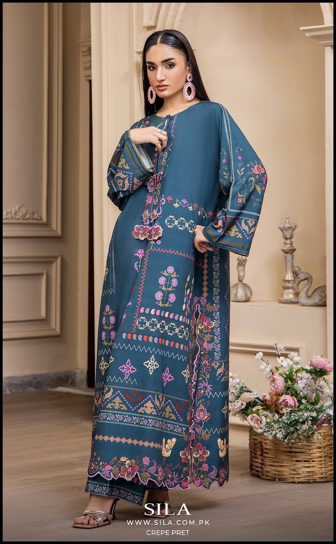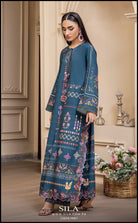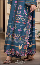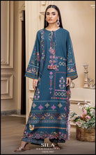 This striking 2-piece ensemble is made from luxurious, flowing printed crepe fabric in a deep teal shade. The long-length shirt features an exquisite digital print, showcasing a beautiful blend of floral and geometric motifs in vibrant shades of pink, purple, and gold. The design is further enhanced by decorative tassel detailing at the neckline, adding a sophisticated, ready-to-wear finish. The set includes a matching trouser to create a cohesive and elegant look, perfect for any festive or semi-formal occasion.