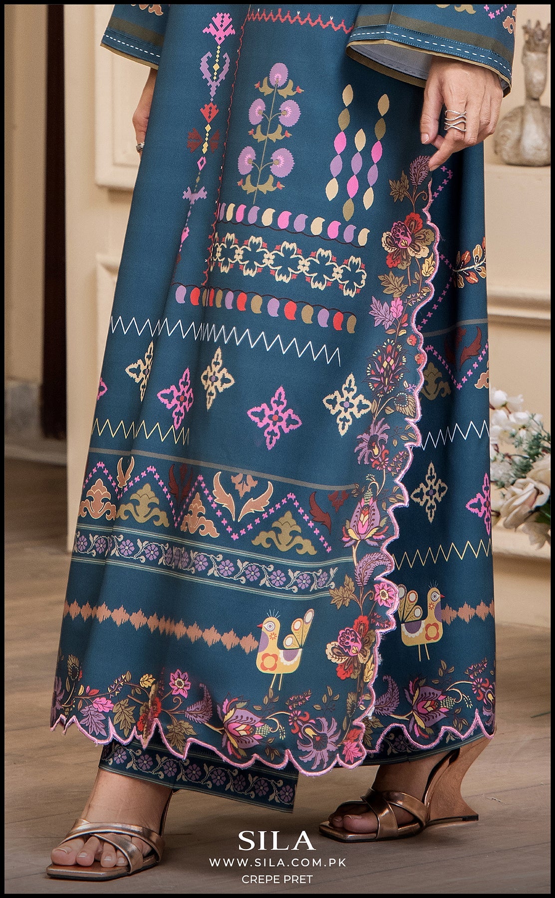 There is embroidered scalloping on the shirt's daman and chak borders, along with scalloped printed tassels.