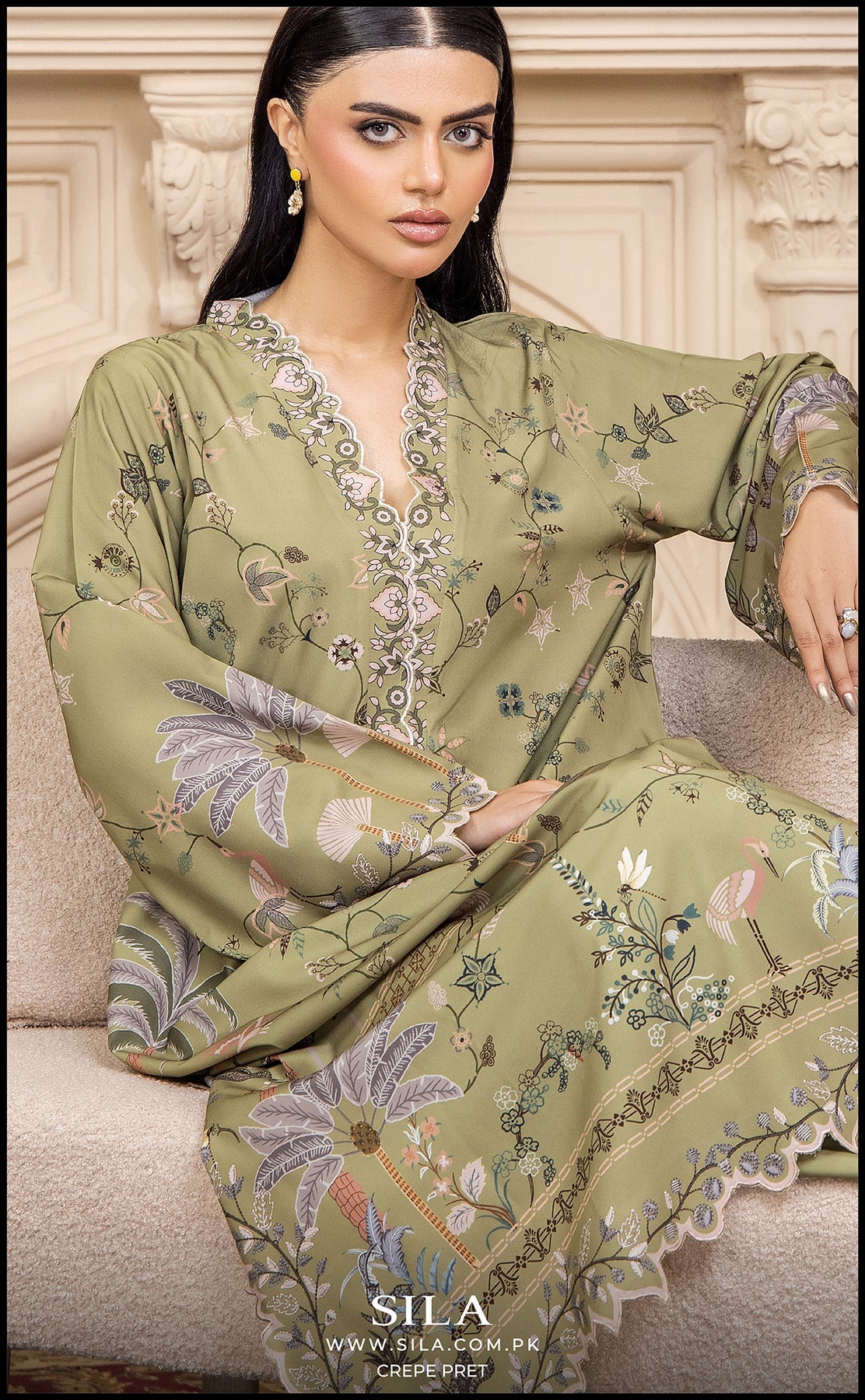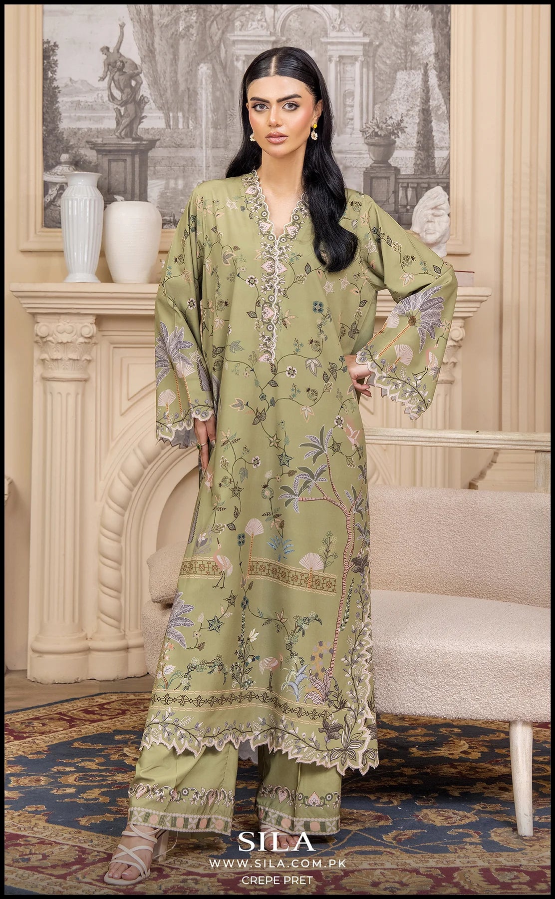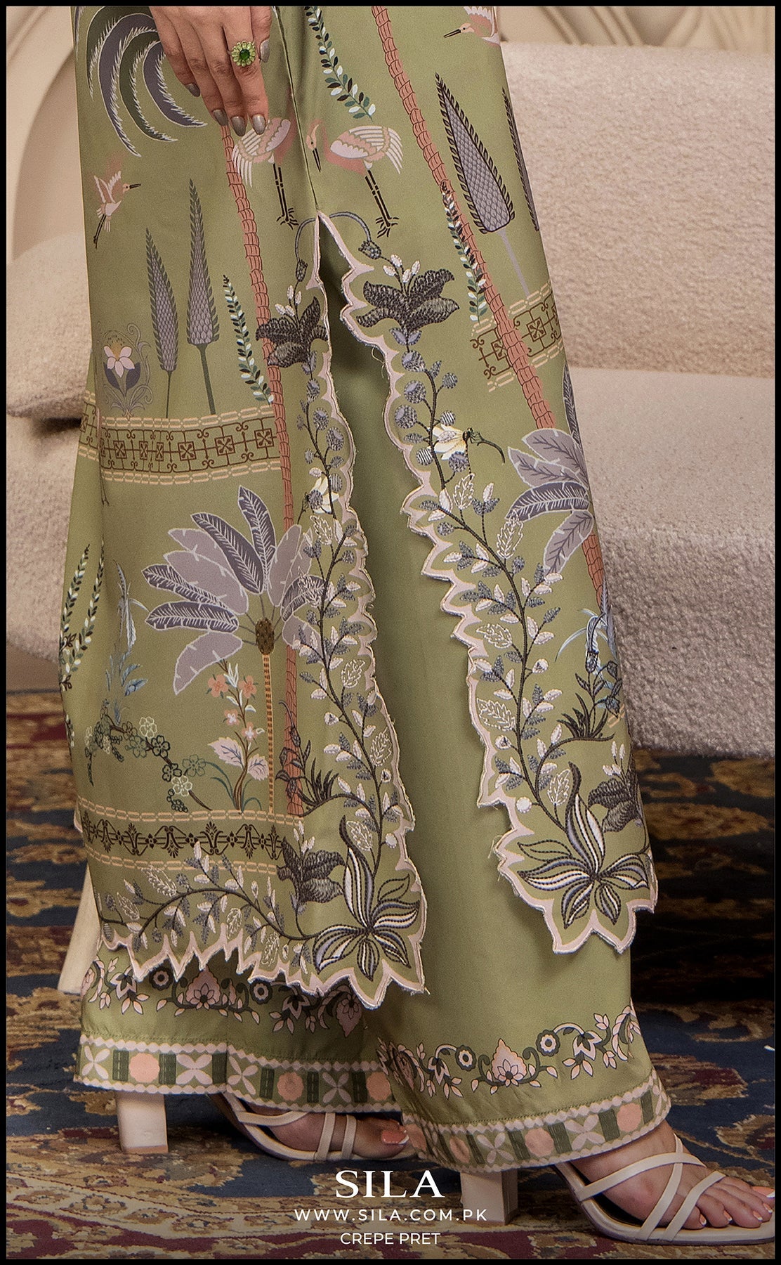 This beautiful 2-piece ensemble is crafted from luxurious, flowing printed crepe fabric in a serene sage green shade. The long-length shirt features an exquisite digital print, showcasing delicate, nature-inspired motifs including florals and foliage in soft complementary tones of lilac, pink, and subtle brown. The sleeves and hemline are finished with decorative scalloping, enhancing its elegant appeal. The set includes a matching wide-leg trouser (implied by to create a cohesive, ready-to-wear look, perfect for a sophisticated daytime or semi-formal event.