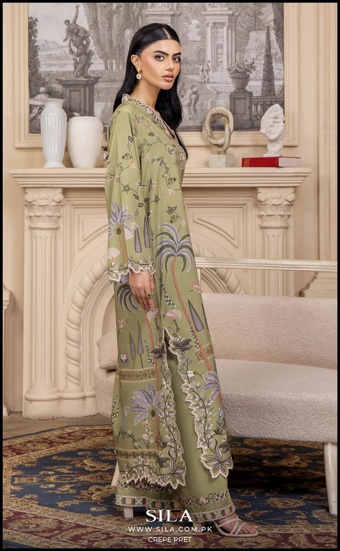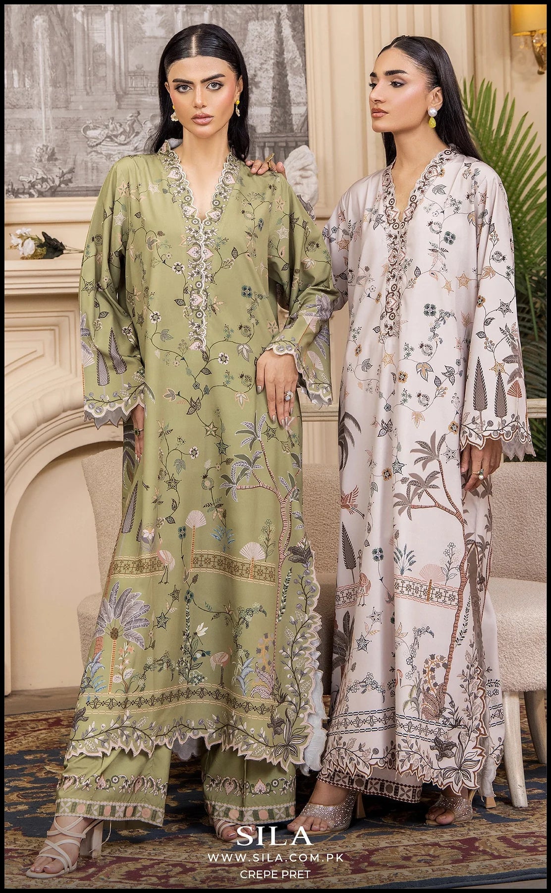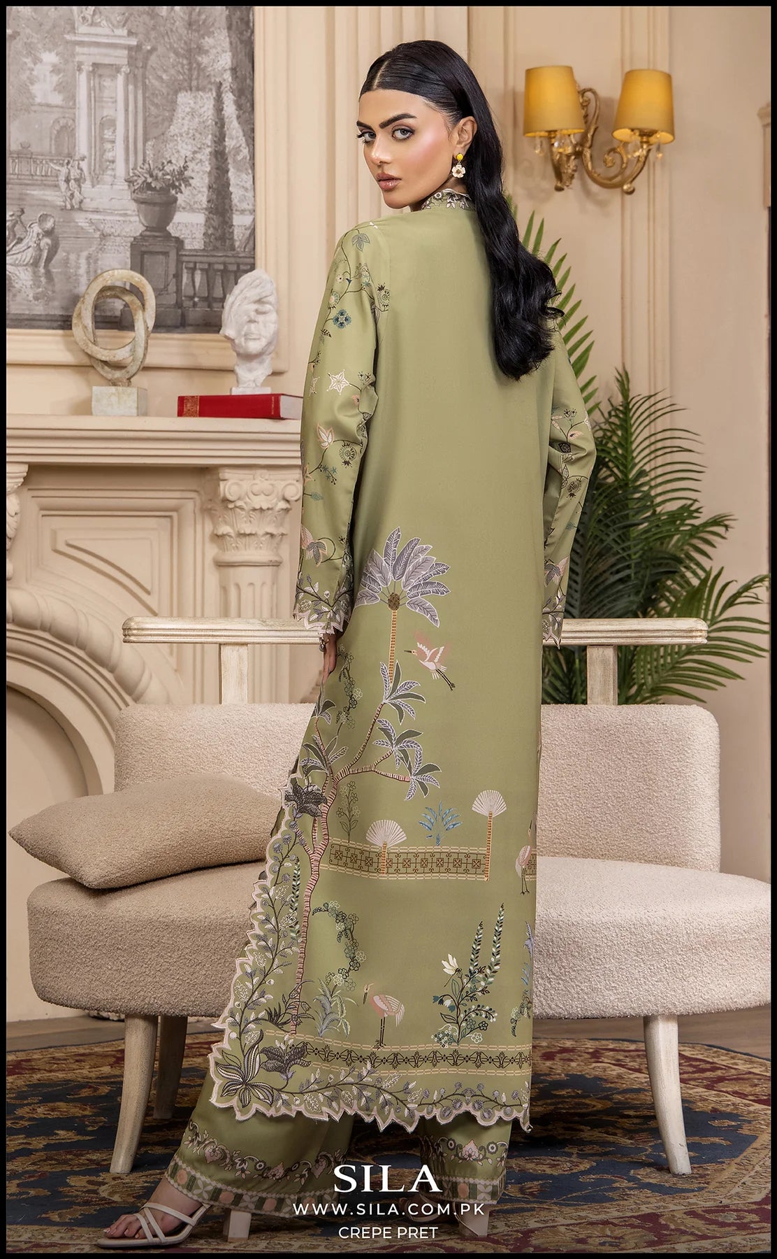 This beautiful 2-piece ensemble is crafted from luxurious, flowing printed crepe fabric in a serene sage green shade. The long-length shirt features an exquisite digital print, showcasing delicate, nature-inspired motifs including florals and foliage in soft complementary tones of lilac, pink, and subtle brown. The sleeves and hemline are finished with decorative scalloping, enhancing its elegant appeal. The set includes a matching wide-leg trouser (implied by to create a cohesive, ready-to-wear look, perfect for a sophisticated daytime or semi-formal event.