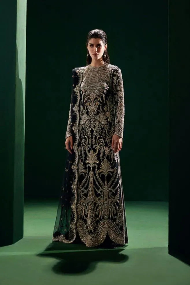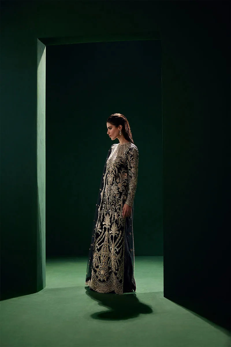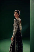 Éclat is a sleek black mock-neck net shirt, adorned with delicate chandi embellishments that gracefully flow across the front and back. It is paired with flared trousers featuring intricate scalloped cutwork, and a matching opulent dupatta.