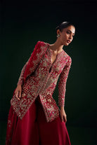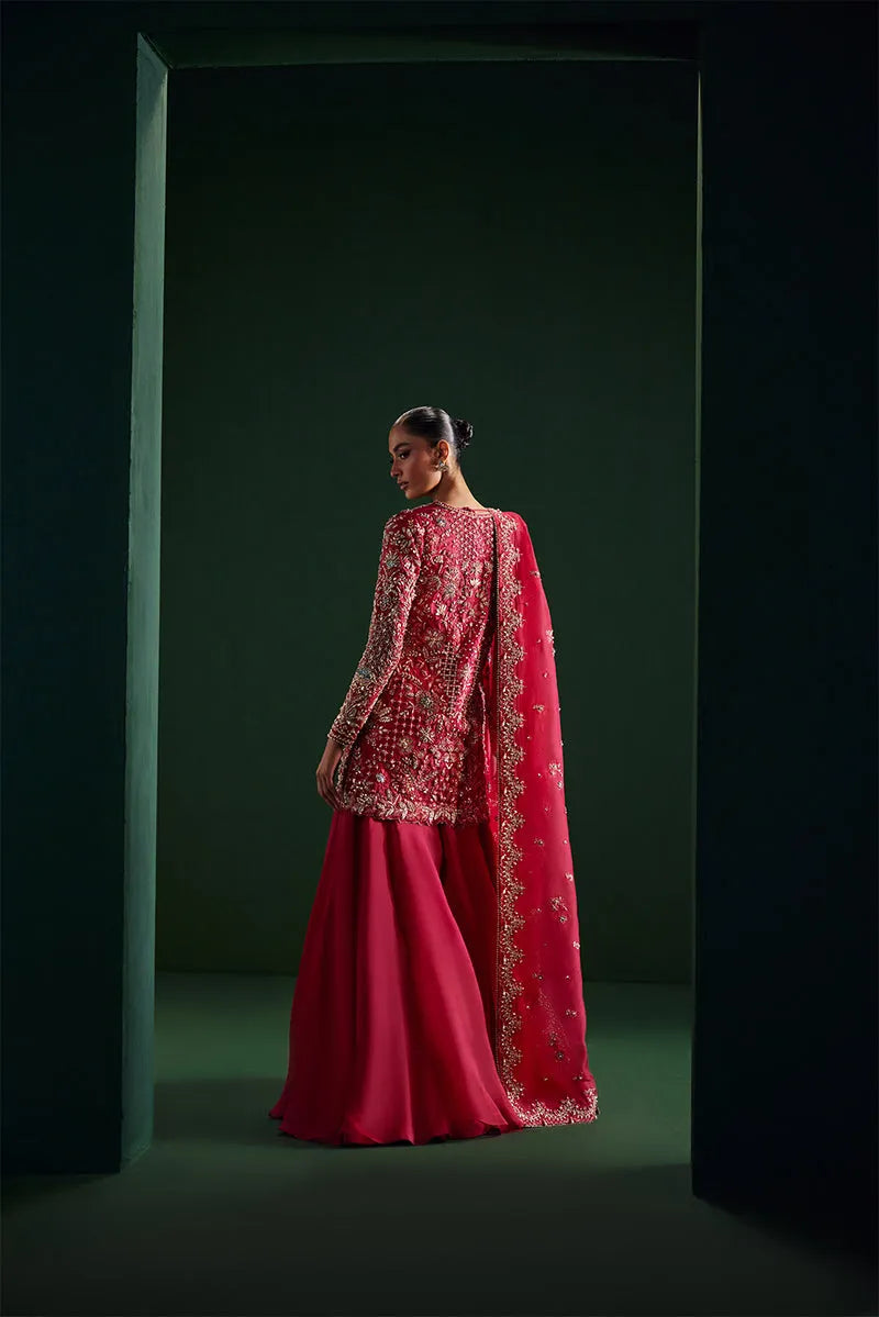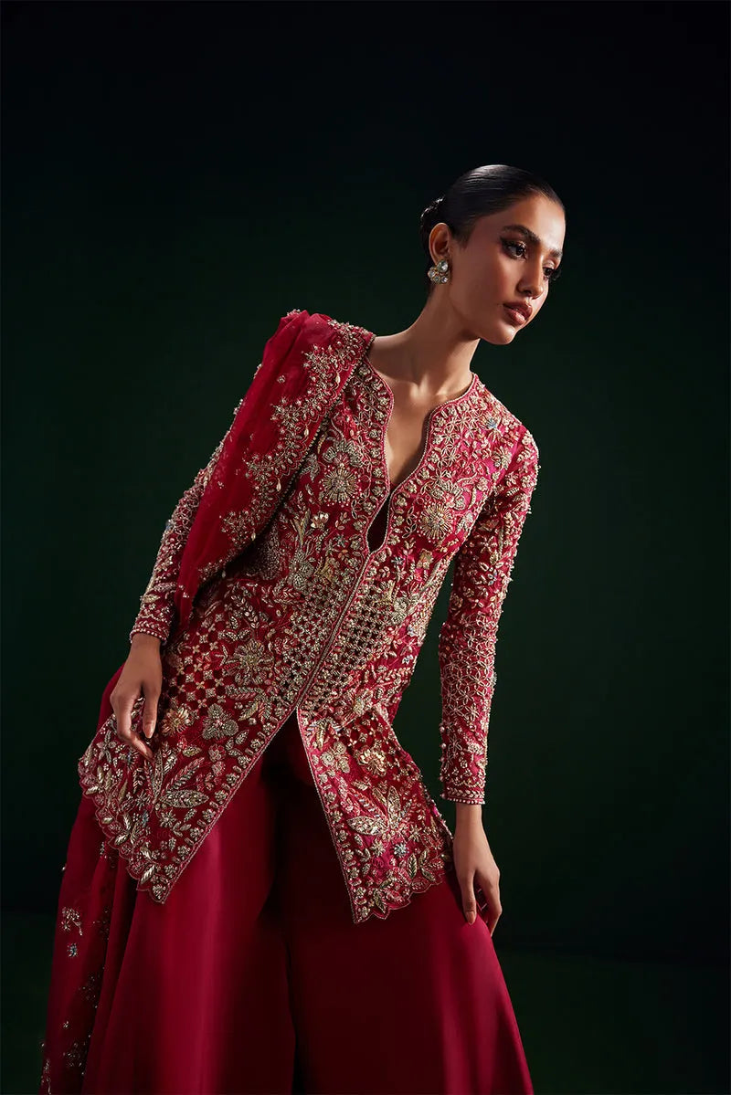 Regal is a striking crimson rose organza short jacket, featuring intricate dabka cutwork and an exquisite seesha steel-toned floral design. It is paired with a matching two tiered sensuous, flowy sharara, and completed with a beautifully embellished dupatta, creating a bold and elegant statement ensemble at any grand occasion.